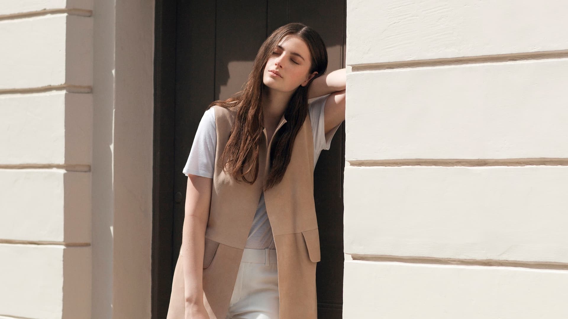 Description: A woman standing outside of a building with her hand on her head and her arm on her shoulder.