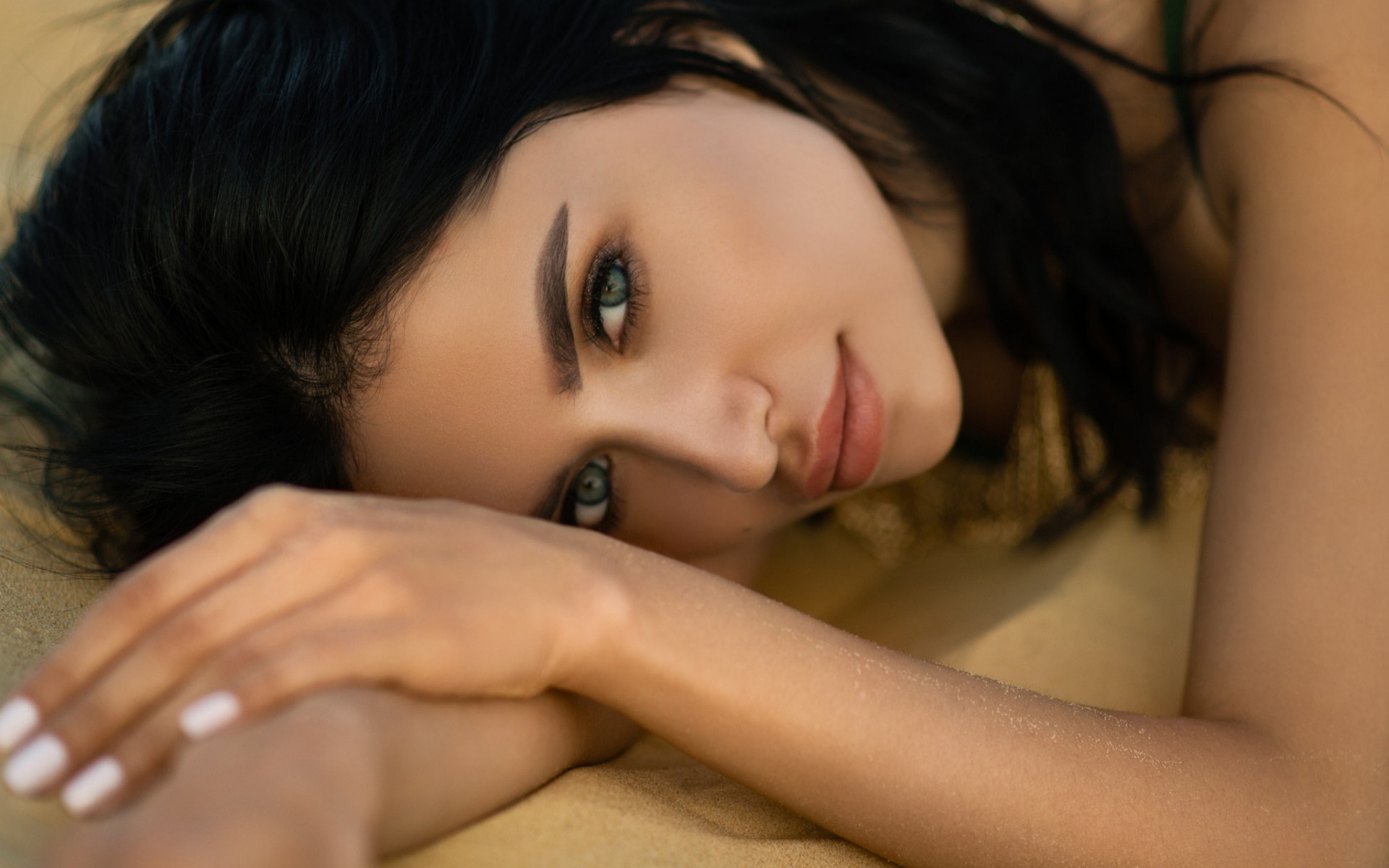 Description: A woman laying on a bed with her hand on her chest and eyes closed.