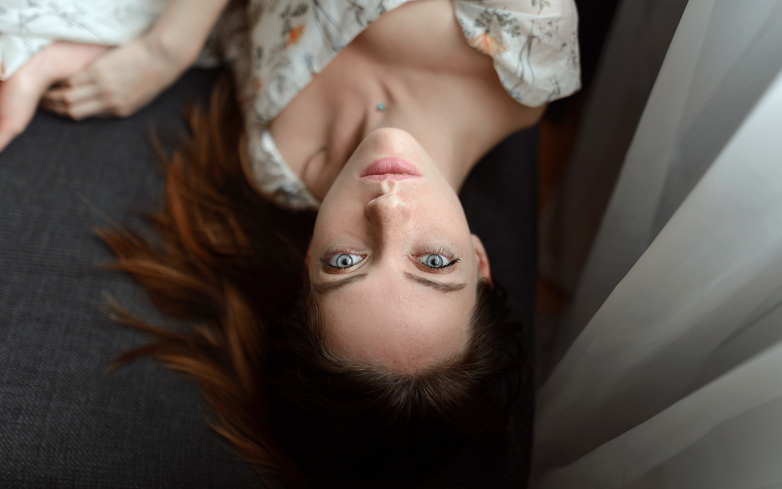 Description: A woman laying on the floor with her eyes open and her head above the floor with her hands on her head.