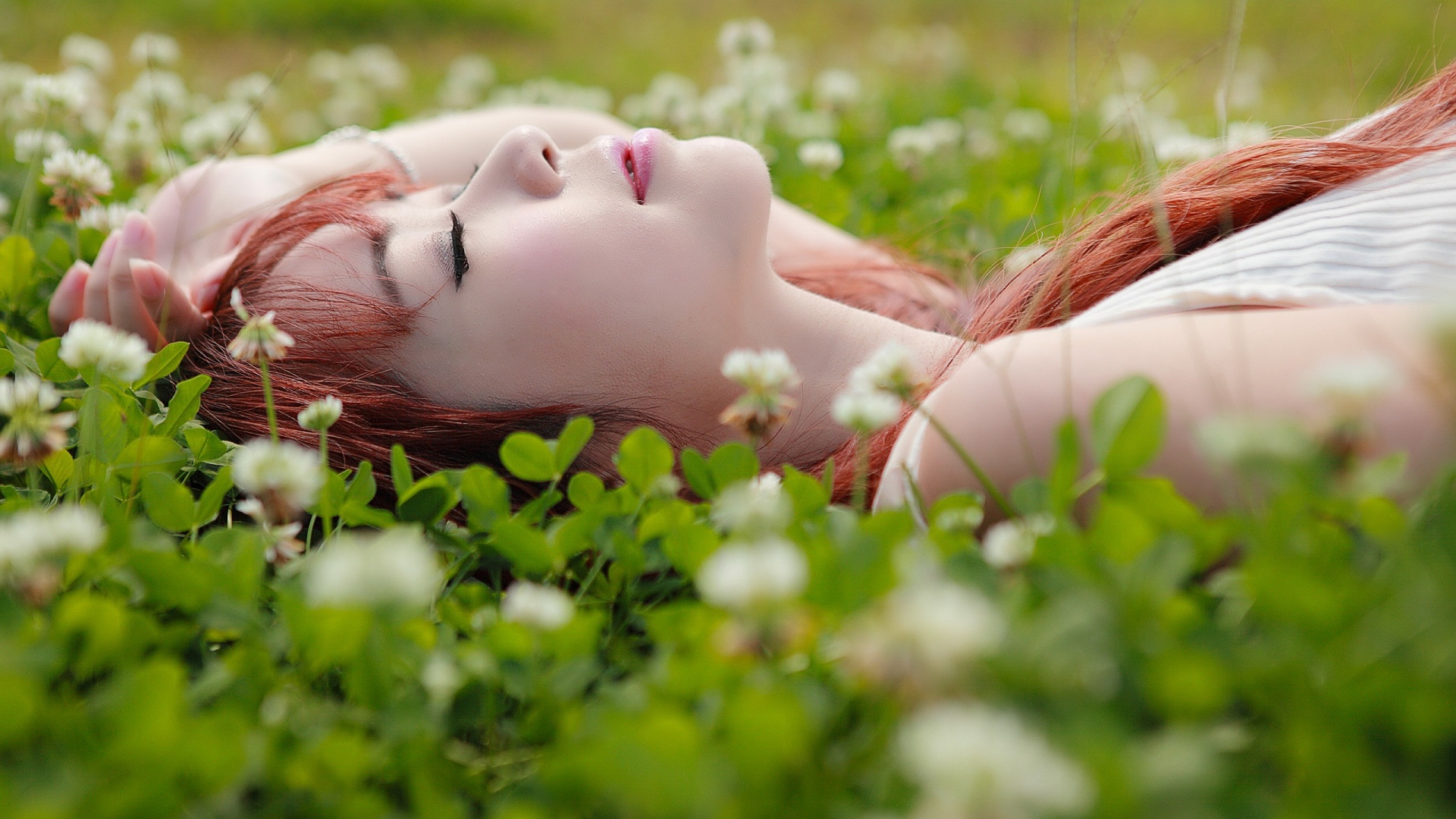 Description: A woman laying in a field of flowers with her eyes closed and eyes closed.