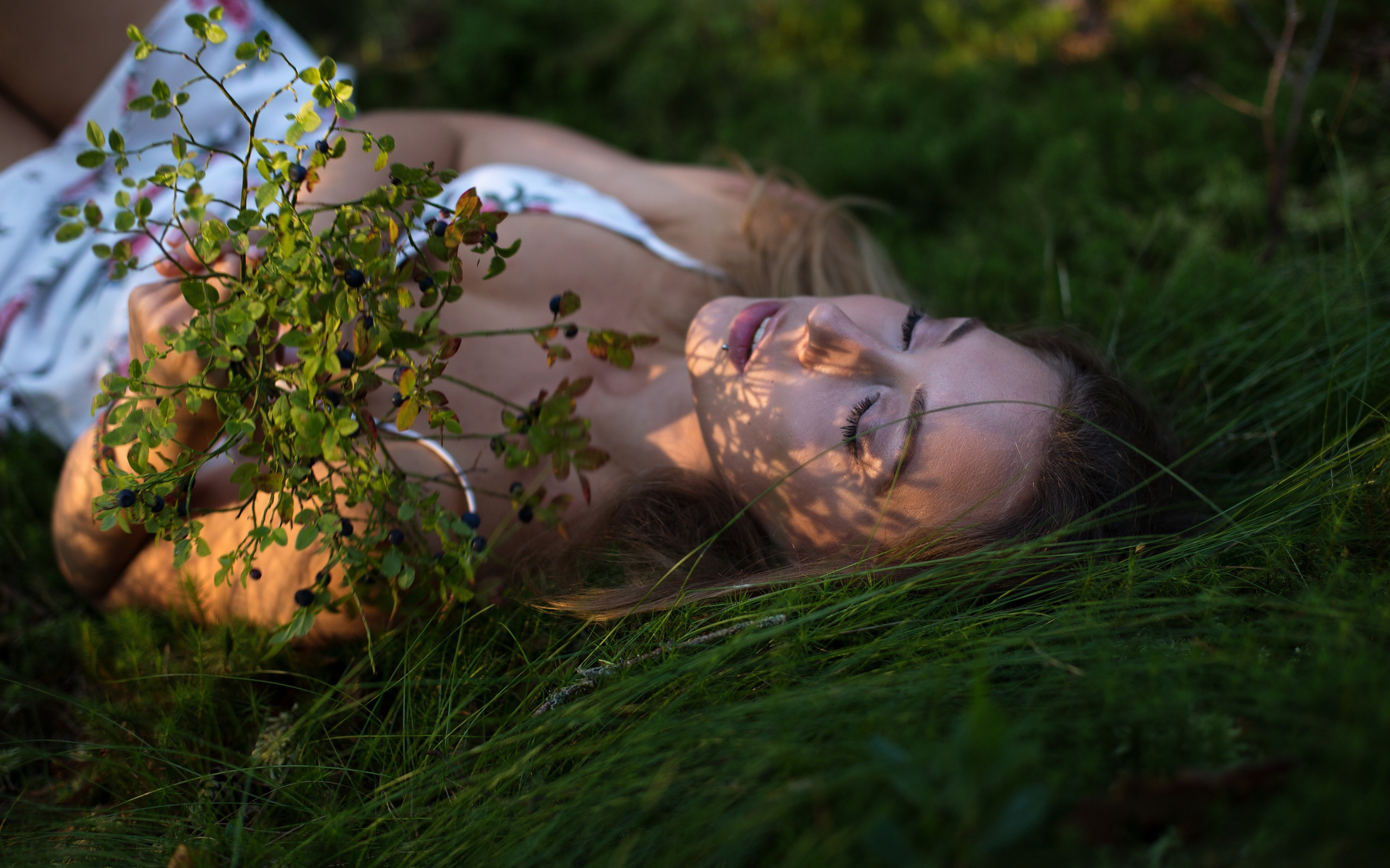 Description: A woman laying on the grass with a plant in her hand and eyes closed.