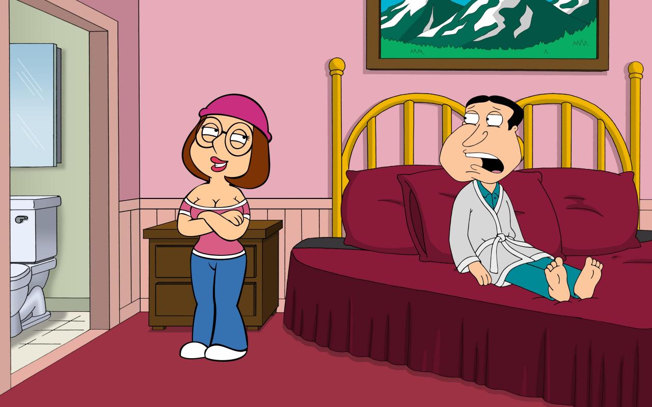 Description: A woman standing next to a man in a bedroom with a bed and a toilet in the background and a painting on the wall.