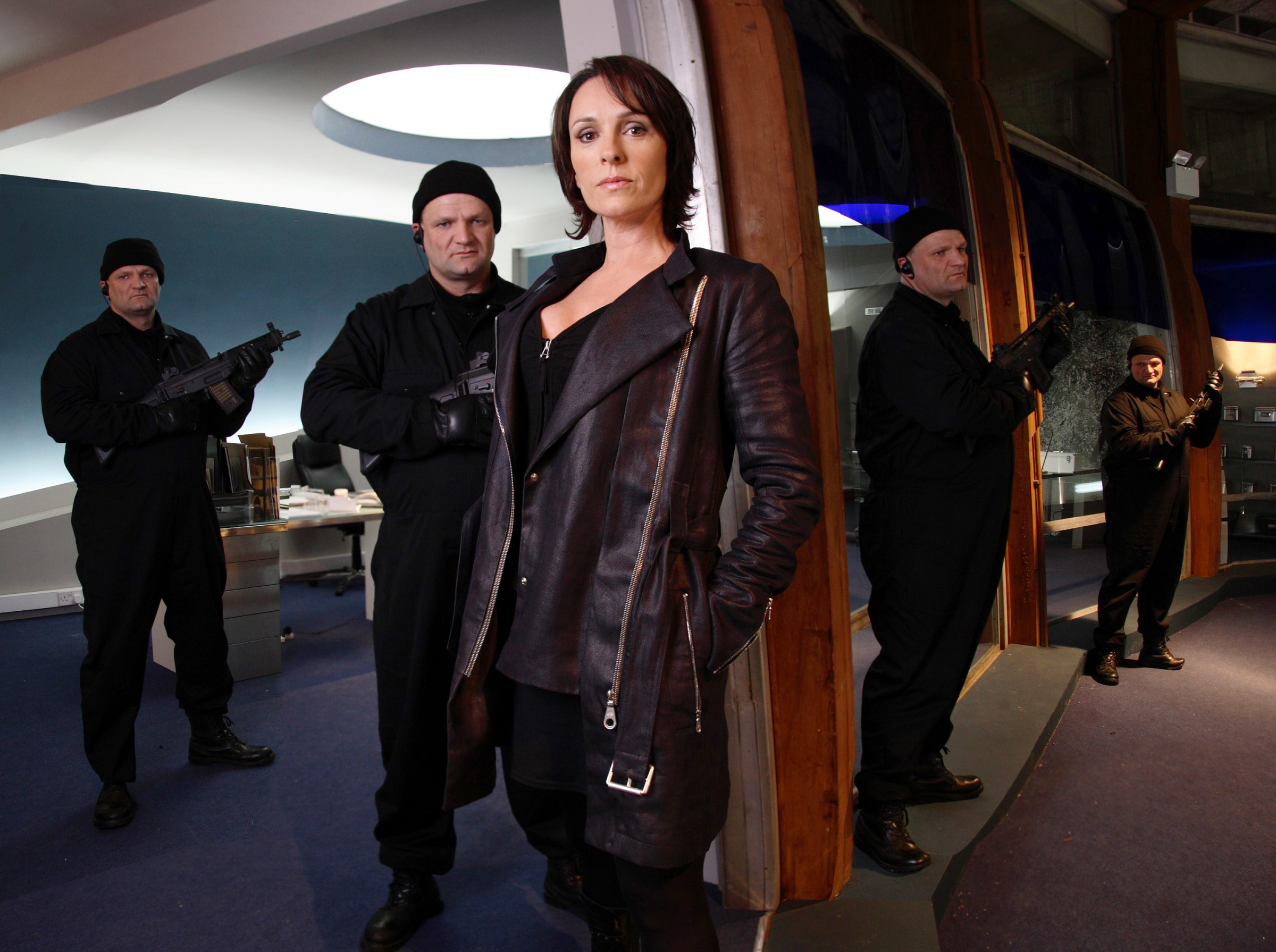 Description: A woman standing in front of a man in a black suit and a man in a black jacket and a woman in a black top.