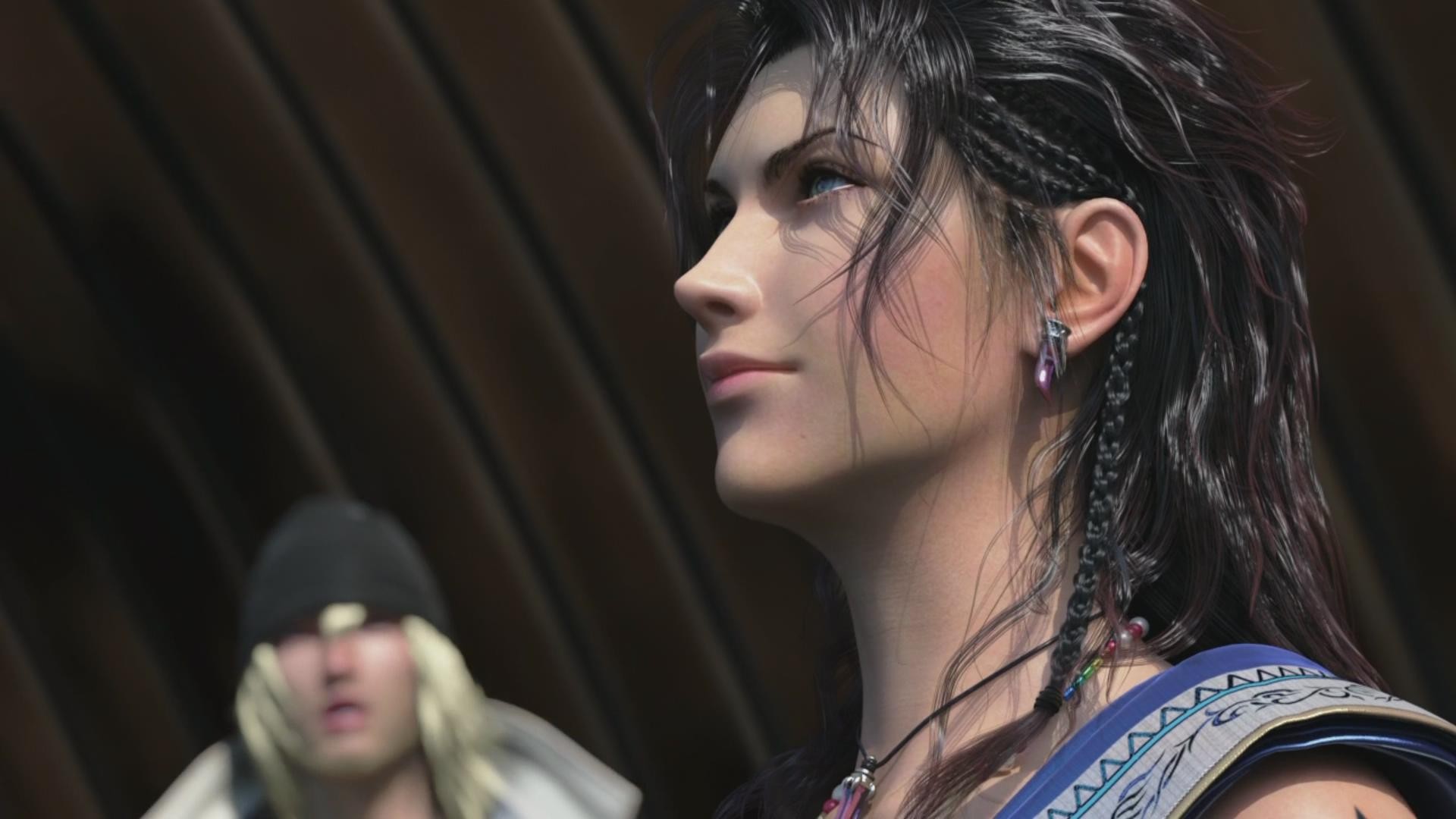 Description: A woman with a black hair and a man with a black hat and a blue shirt and a black hat.
