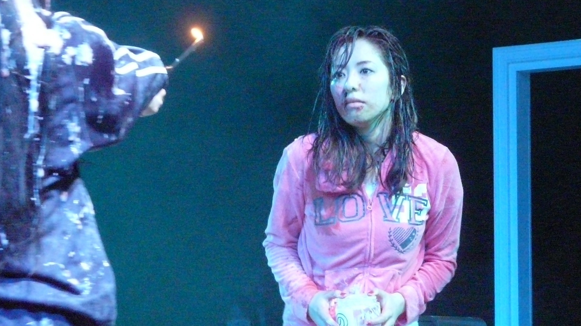 Description: A woman standing next to a man holding a cigarette in her hand and a lighter in her mouth in front of her.