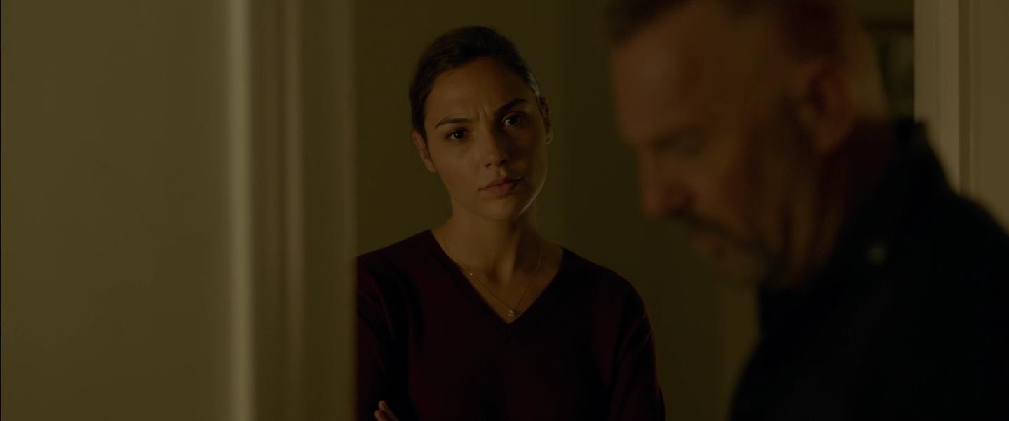 Description: A woman standing next to a man in a hallway with a dark background and a light on the wall.