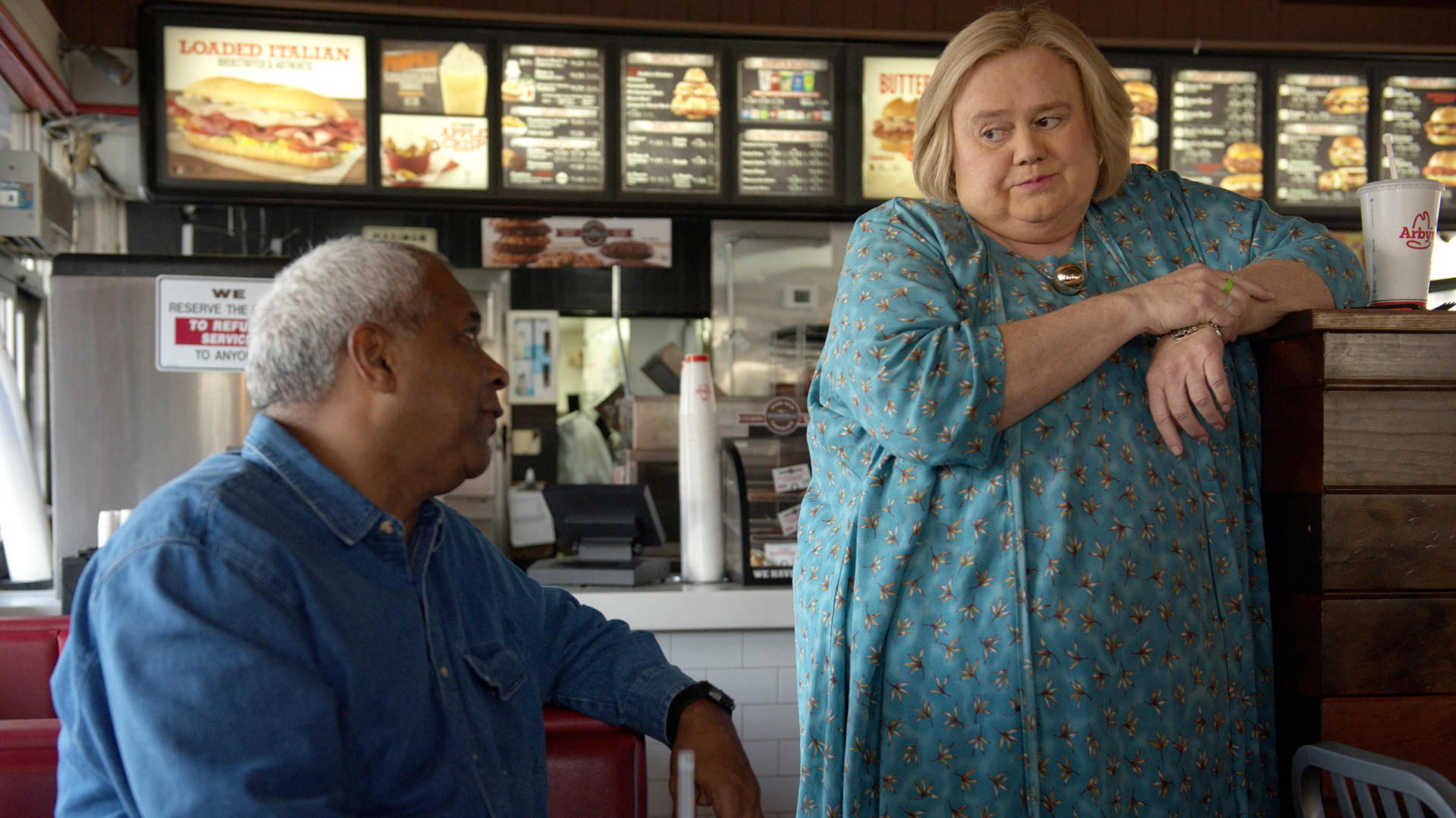 Description: A woman standing next to a man in a restaurant with a menu behind her and a menu behind her.