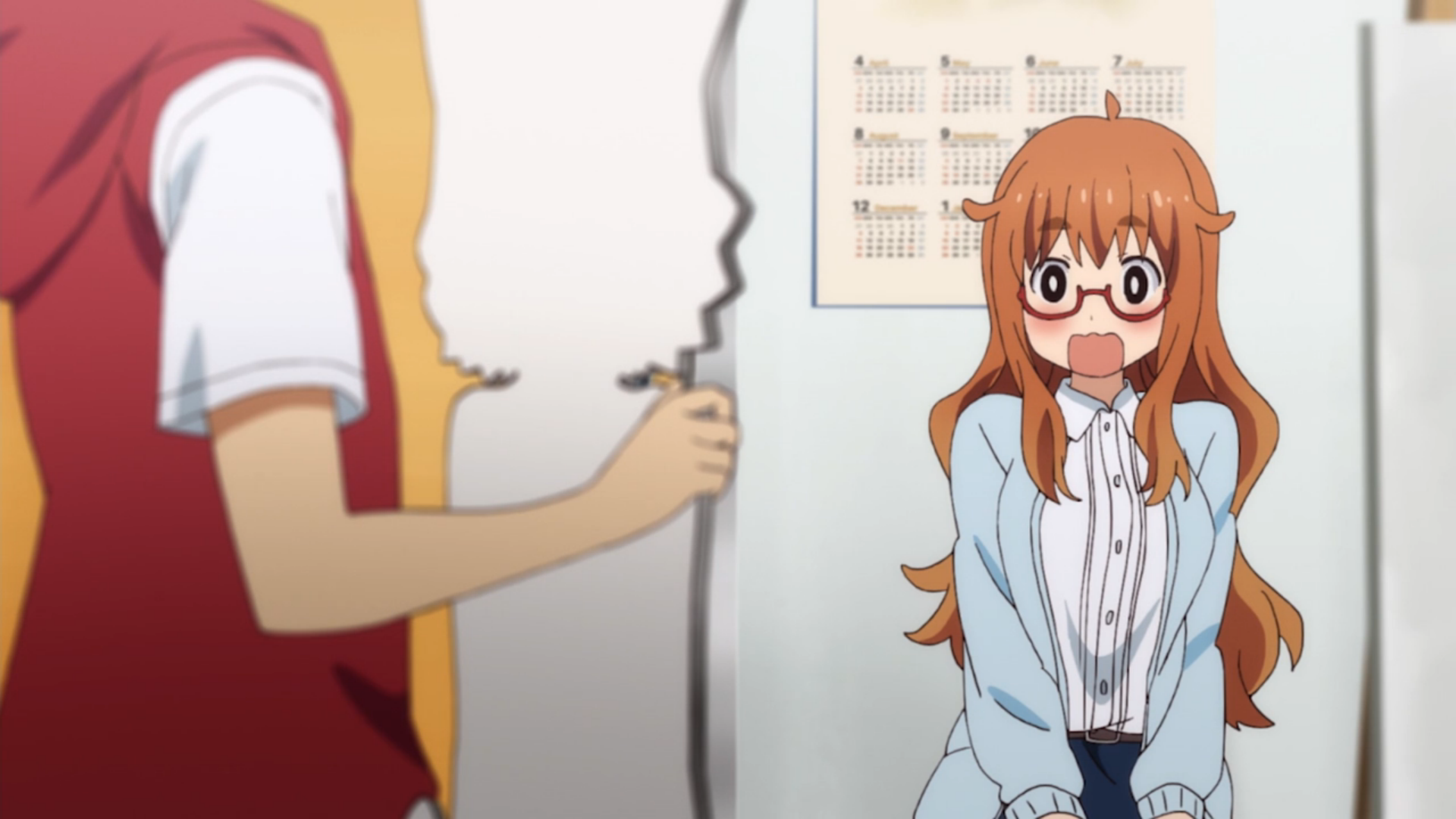 Description: A woman standing next to a man in a room with a calendar on the wall behind her and a door.