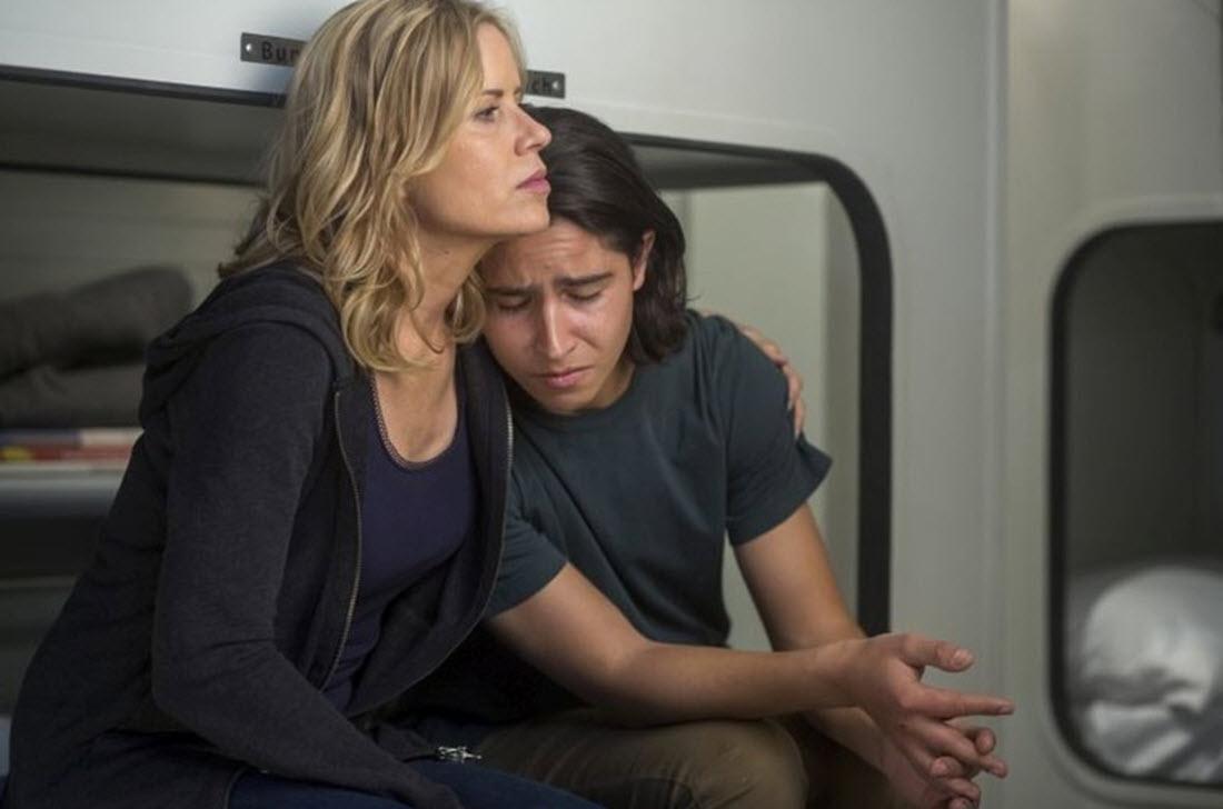 Description: A woman and a man sitting on a train looking at each other's eyes and looking at something.