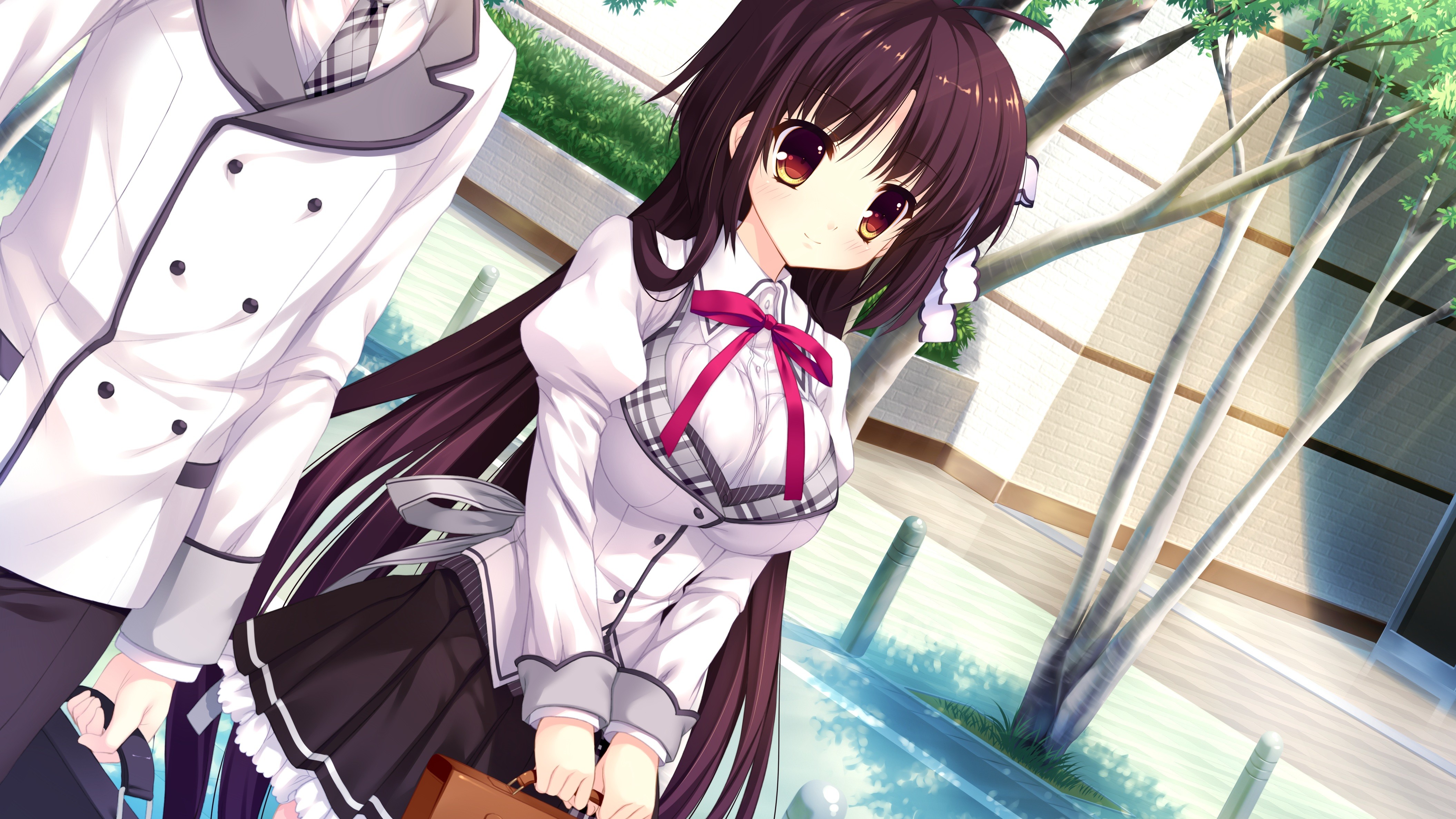 Description: A woman in a white shirt and a man in a white shirt and tie and a brown bag and some trees.