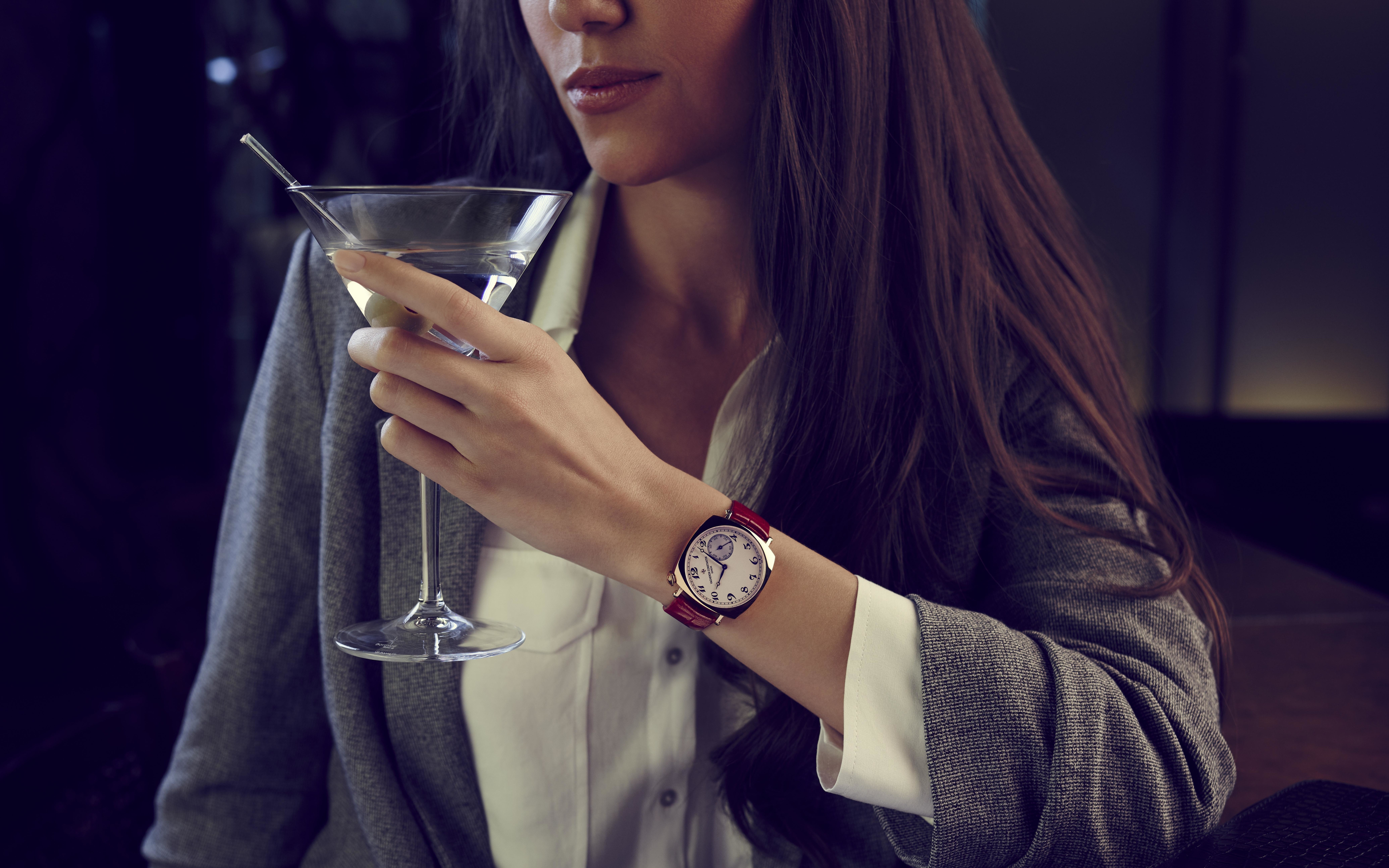 Description: A woman holding a martini glass in her hand and looking at her watch on her wrist while sitting down.