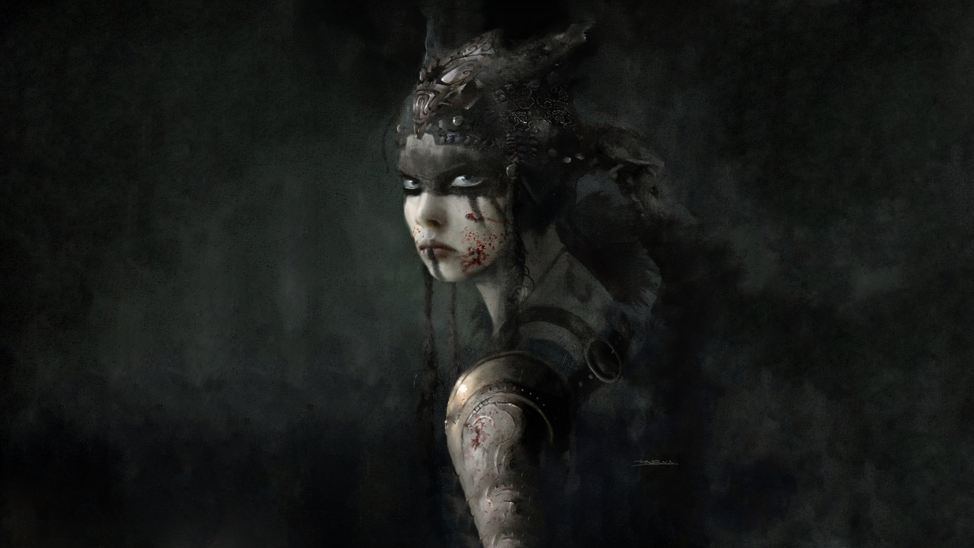 Description: A woman with a mask and a body painted white and black with blood on her face and arm.