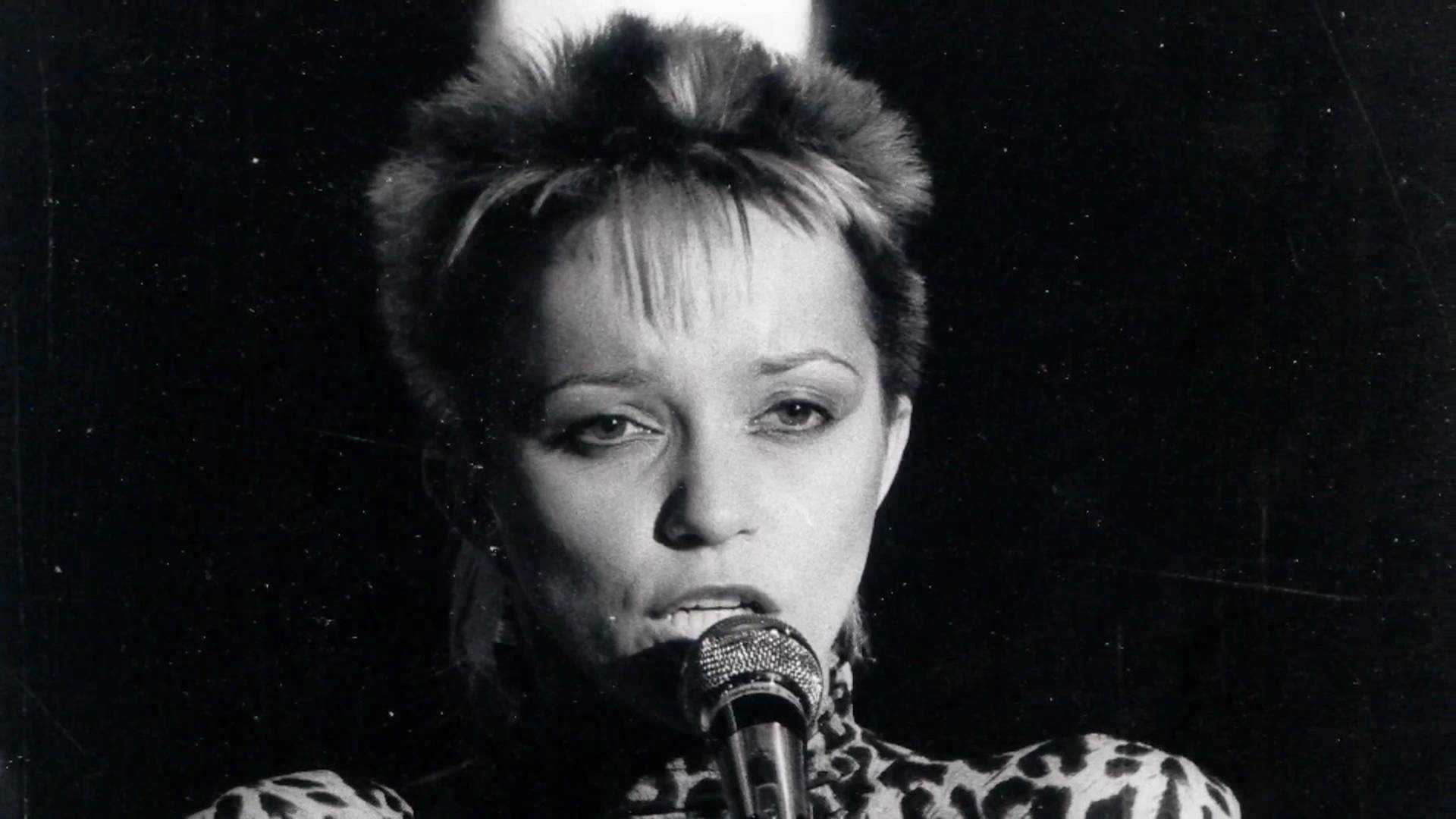 Description: A woman with a microphone in her hand and a cat on her head in a black and white photo.