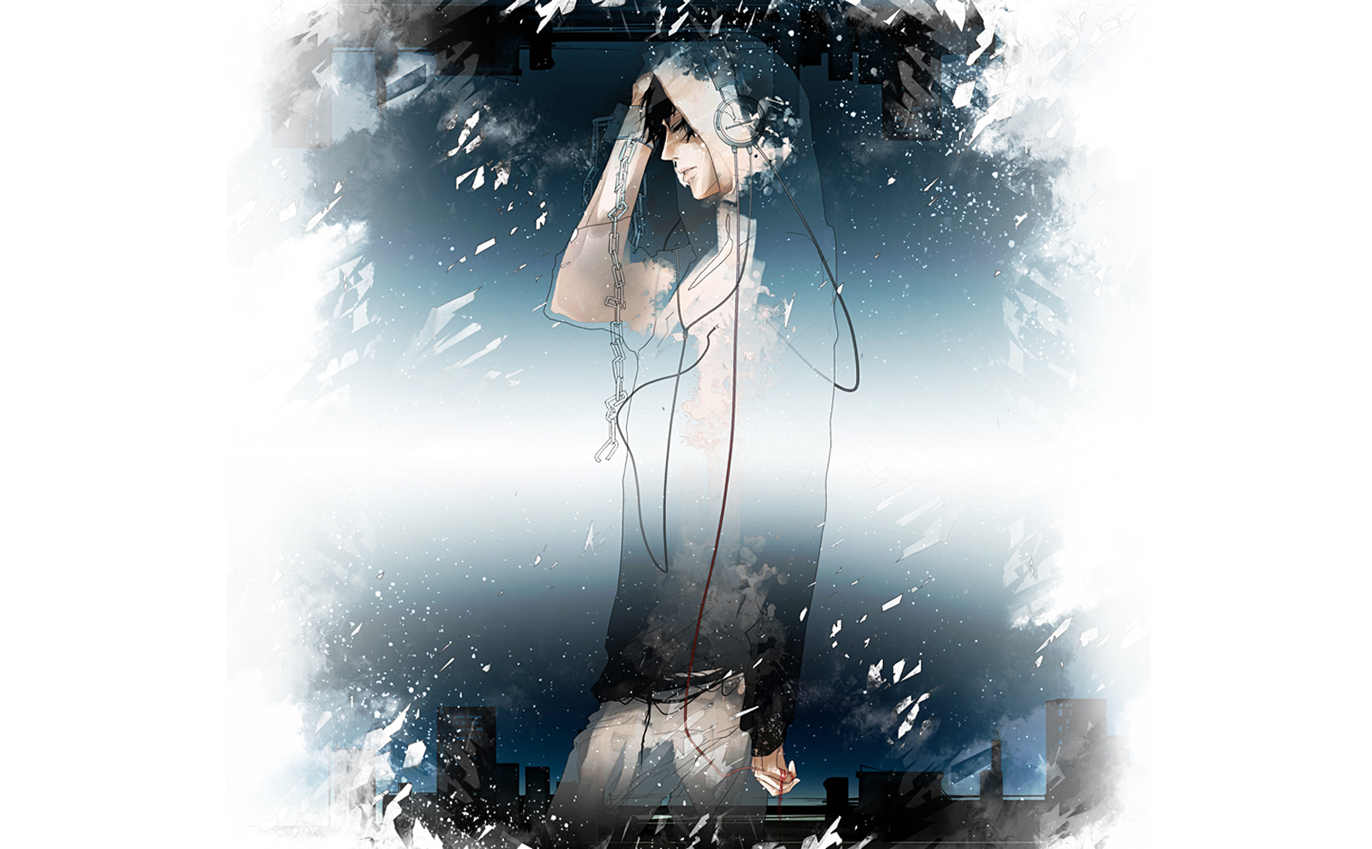 Description: A woman with a microphone in her hand and a city in the background with snow falling on her head.