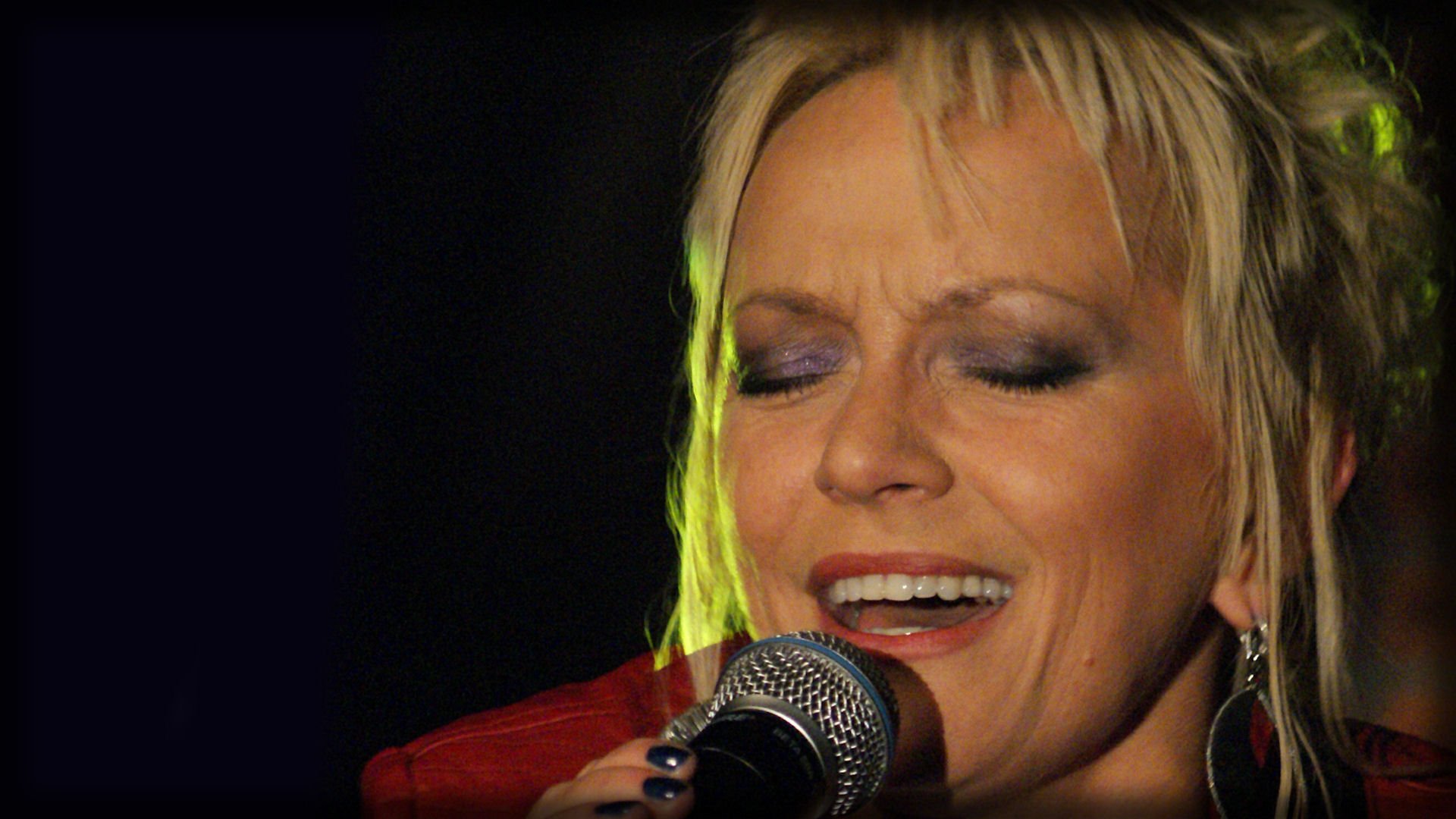 Description: A woman with a microphone in her hand and a green light on her face and hair blowing in the wind.
