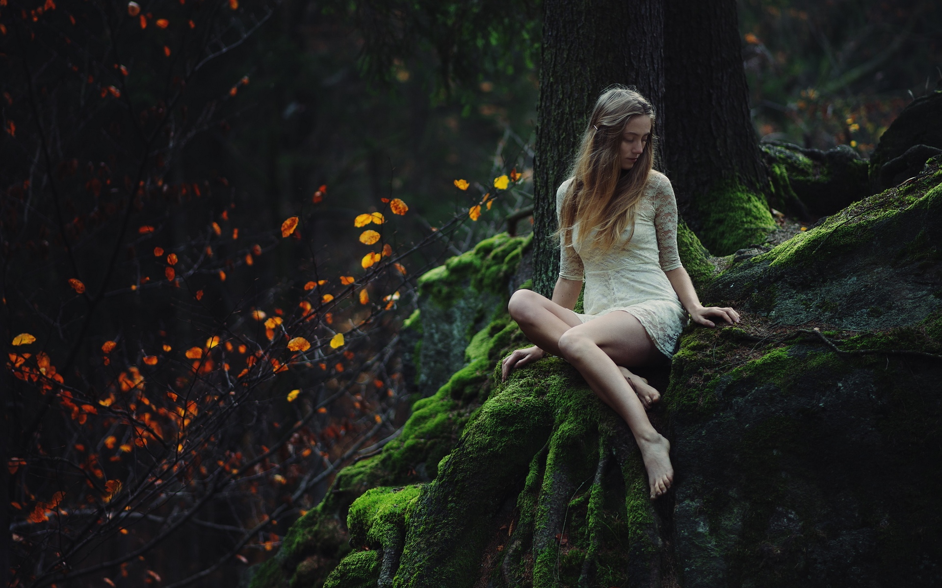 Description: A woman sitting on a moss covered rock in the woods with her legs crossed and her legs crossed.
