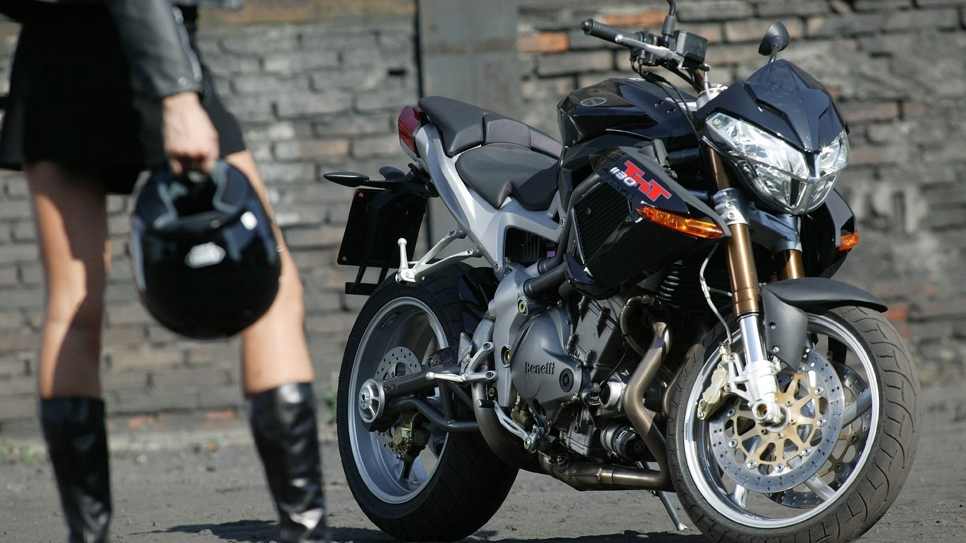 Description: A woman in black boots and boots walking past a motorcycle parked on the street with a black bag on it.