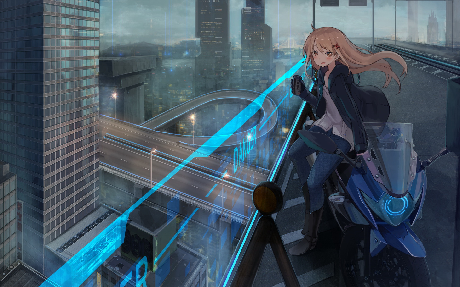 Description: A woman riding a motorcycle on top of a city street next to tall buildings with blue lights on them.