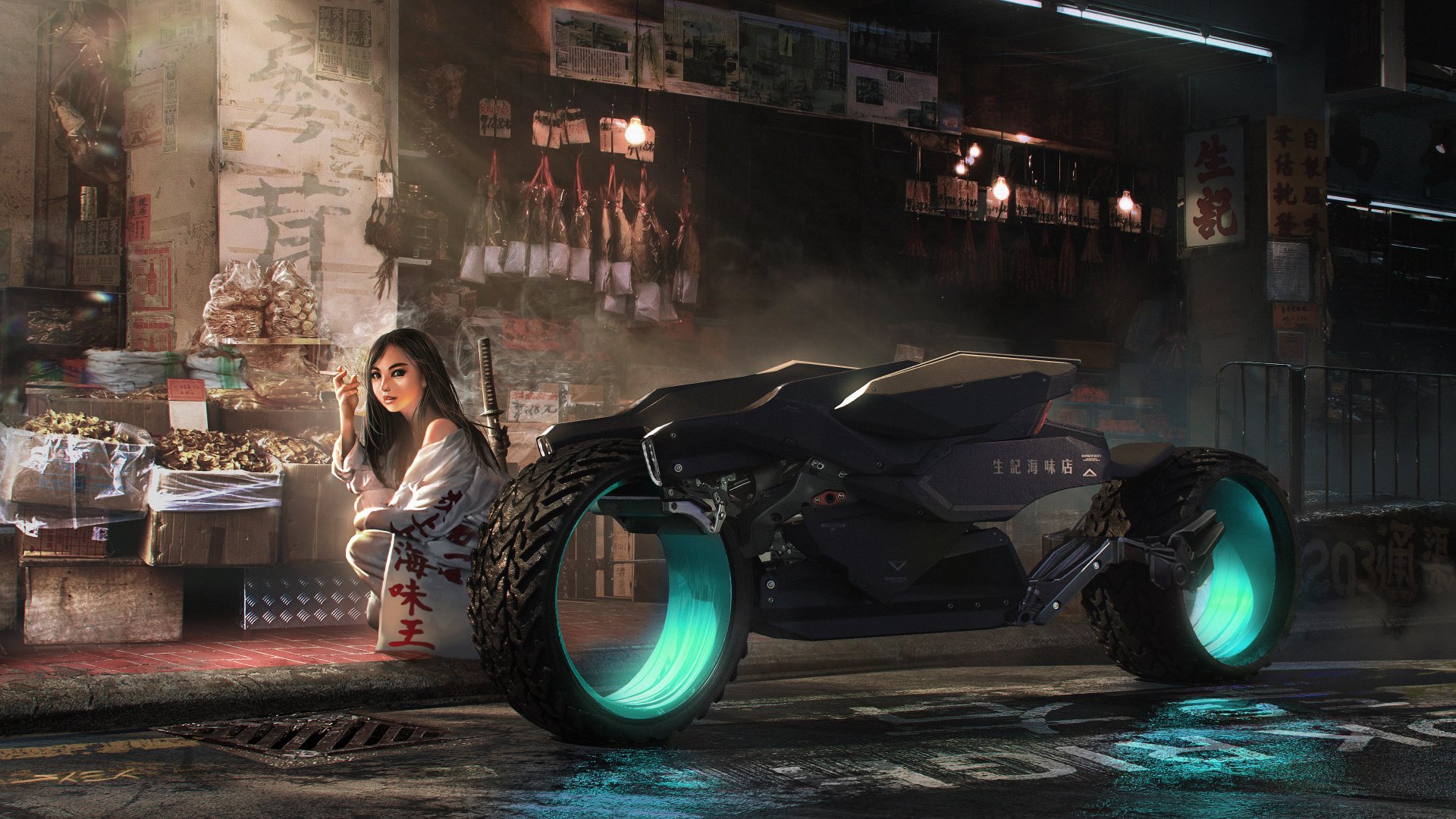 Description: A woman sitting on a motorcycle with a green tire on the street in a dark city at night with a neon light.