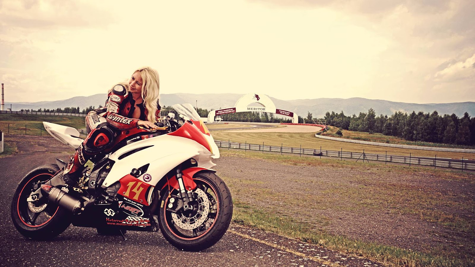 Description: A woman sitting on a motorcycle on a road near a field and a fence with a plane in the background.