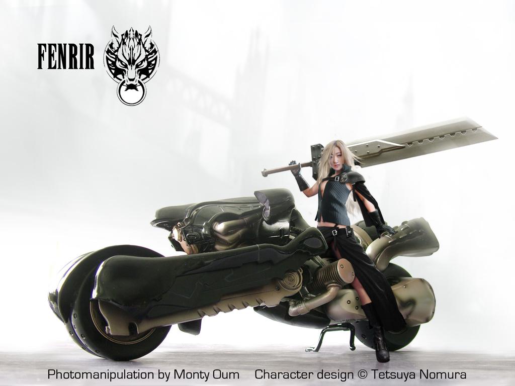 Description: A woman standing next to a motorcycle with a sword on it's back end and a sword in the back.