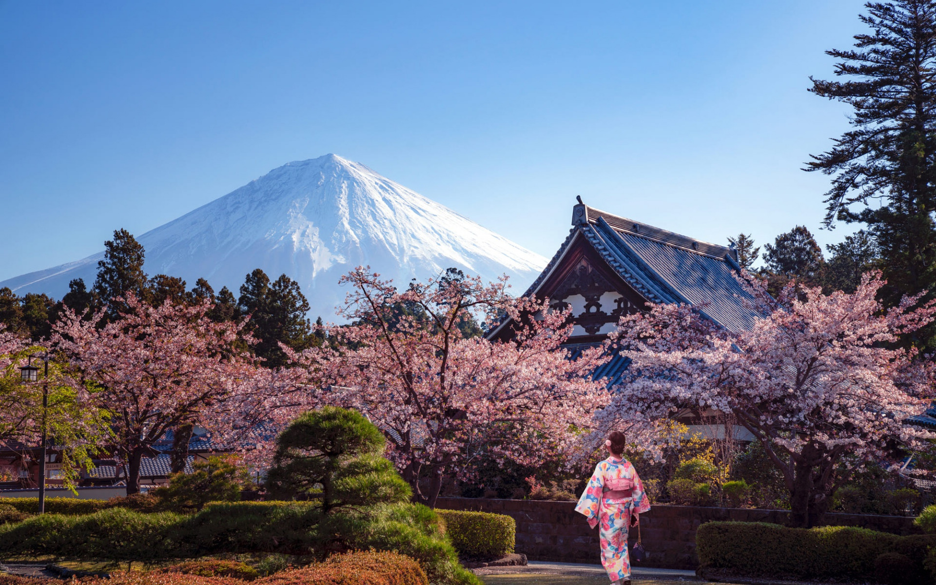Description: A woman walking in front of a mountain with cherry blossoms on it's trees and bushes in front of her.