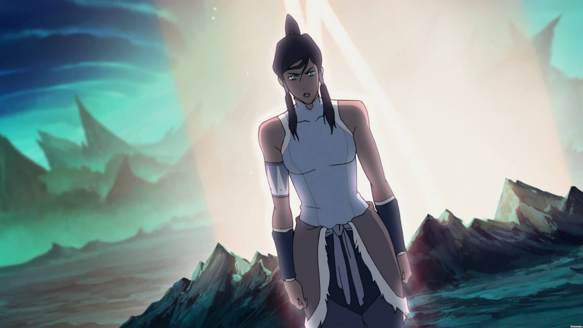 Description: A woman standing in front of a mountain with a light shining on her face and a sky background with mountains.