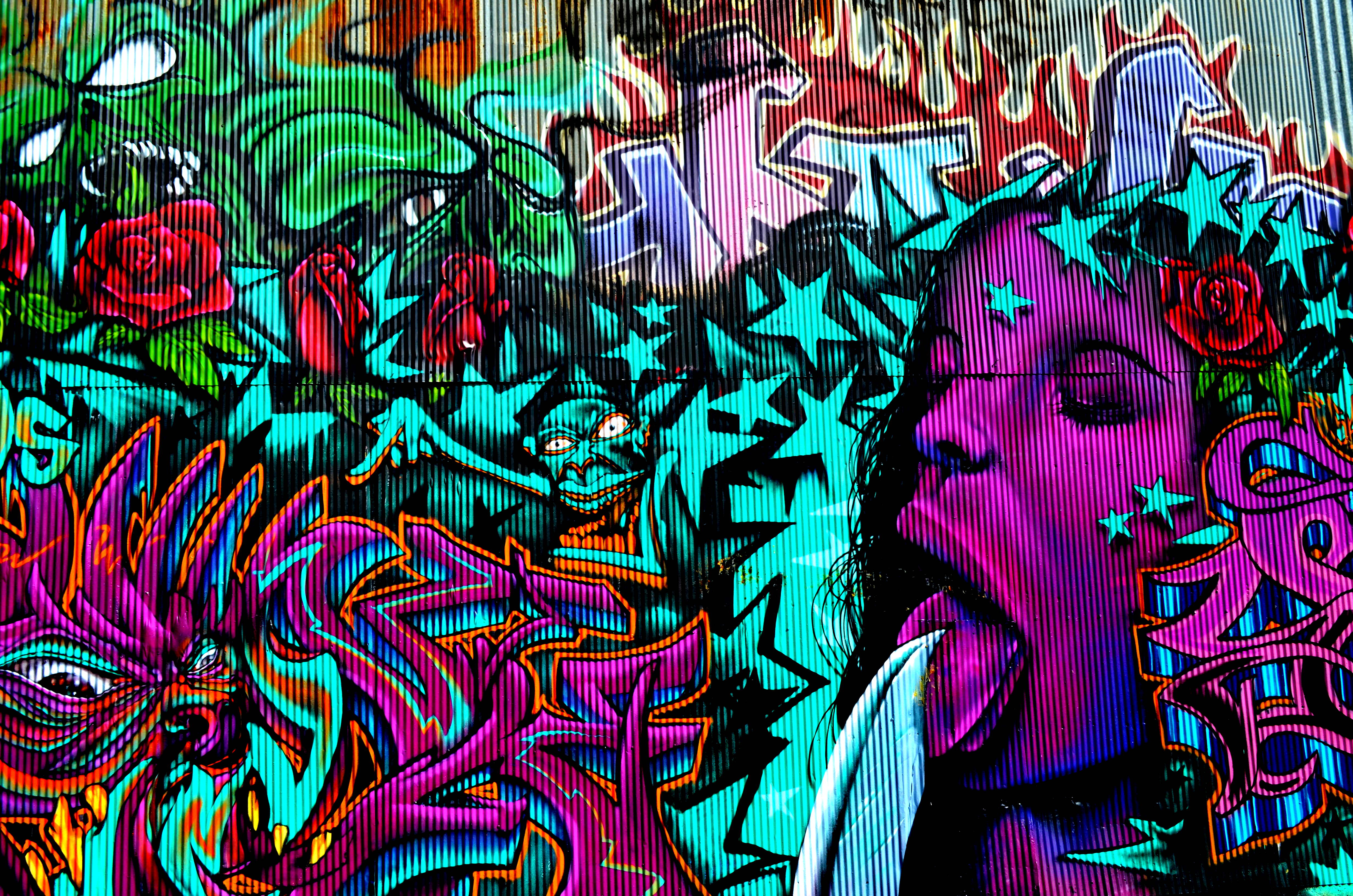 Description: A woman with her mouth open in front of a graffiti wall with a knife in her mouth and a knife in her mouth.