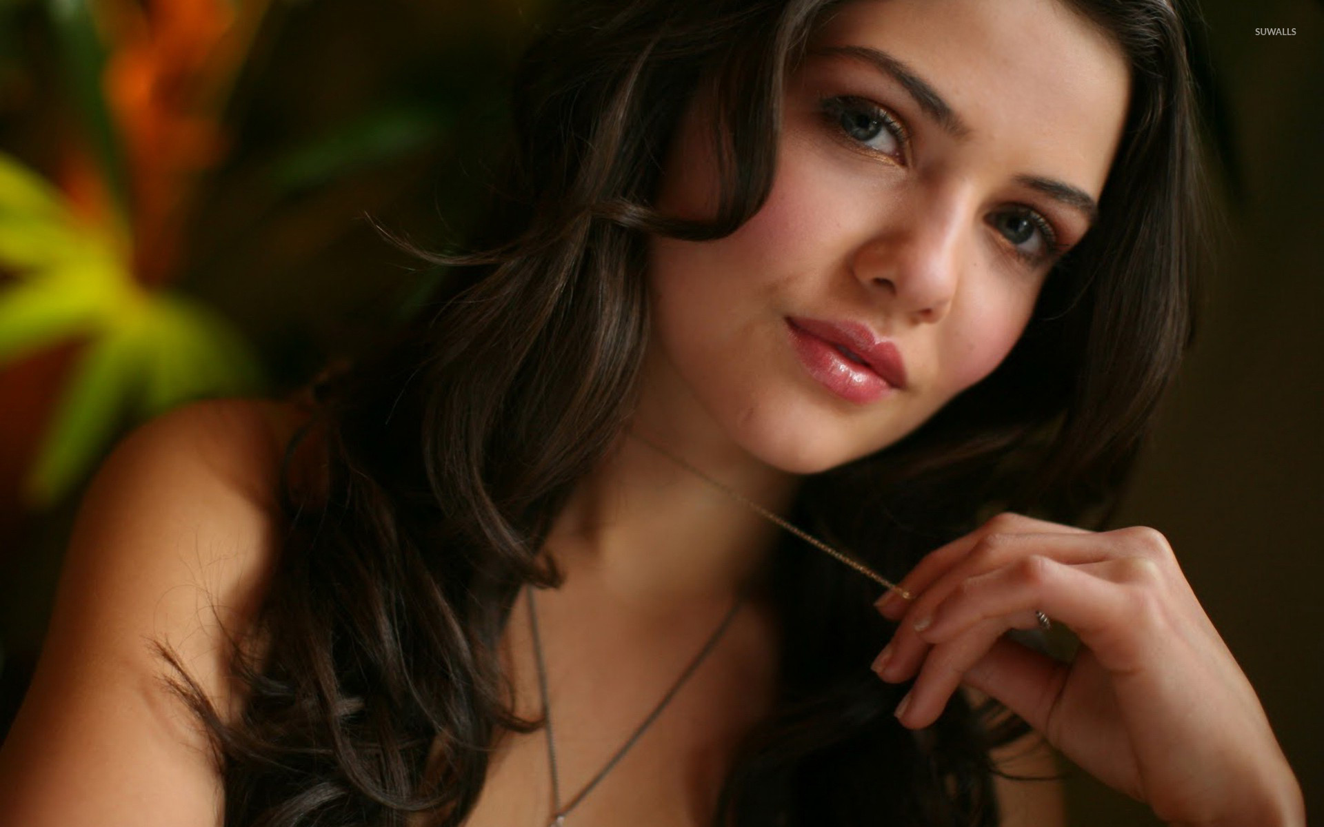 Description: A woman with a necklace on her neck posing for a picture with a flower in the background and a plant behind her.