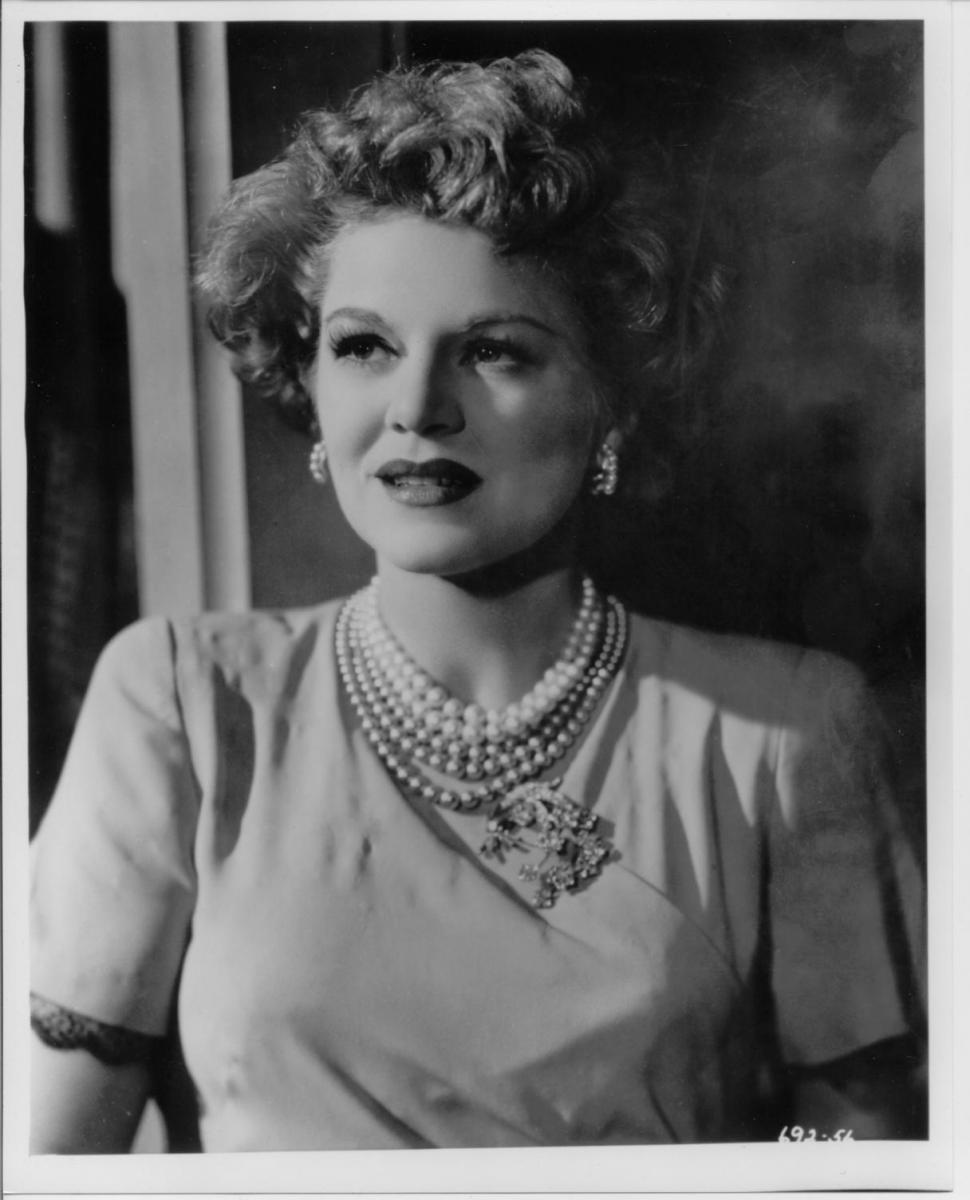 Description: A woman wearing a necklace and pearls in a black and white photo with a window behind her and a curtain behind her.