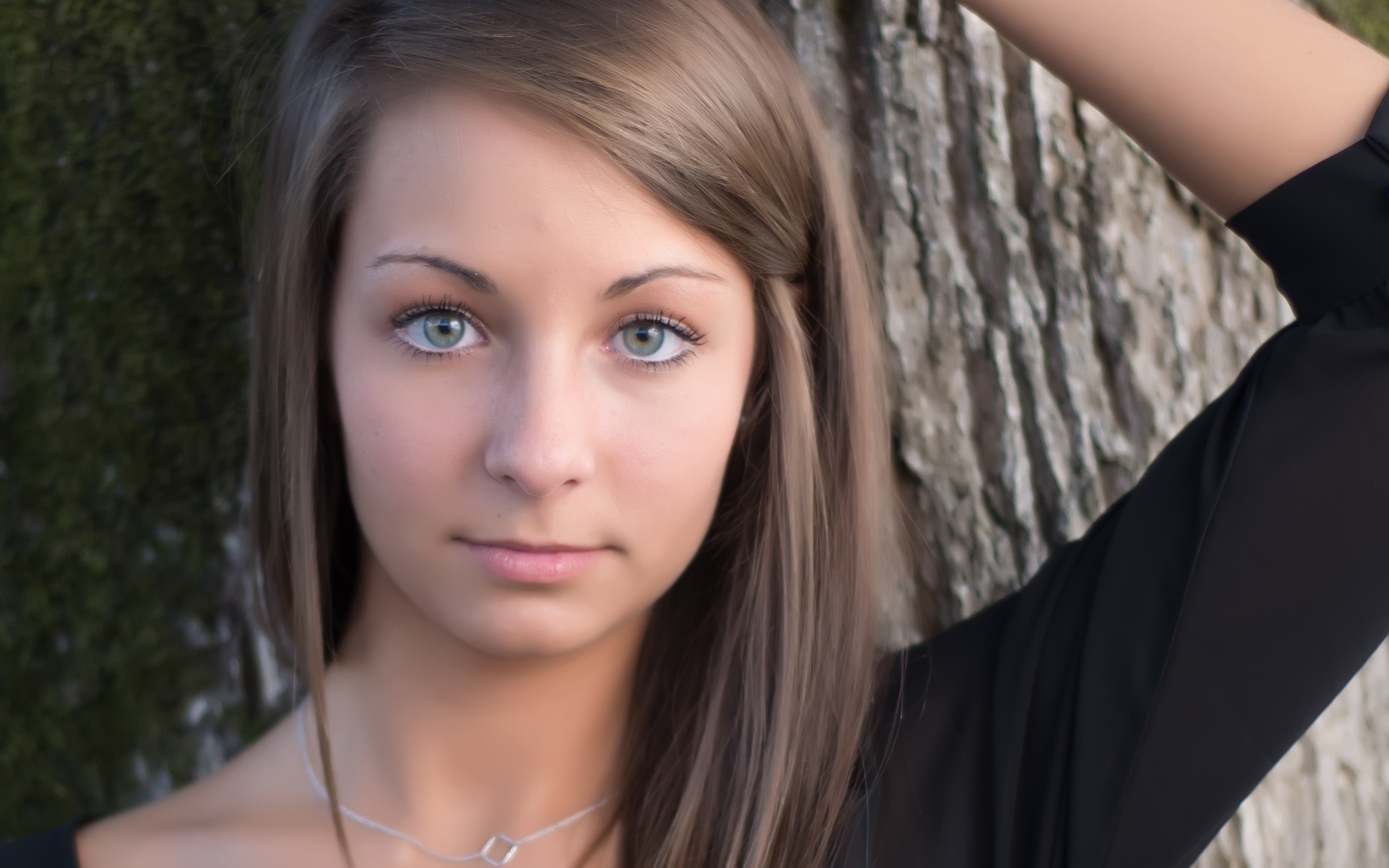 Description: A woman with a necklace on her neck posing for a picture in front of a tree with a green background.