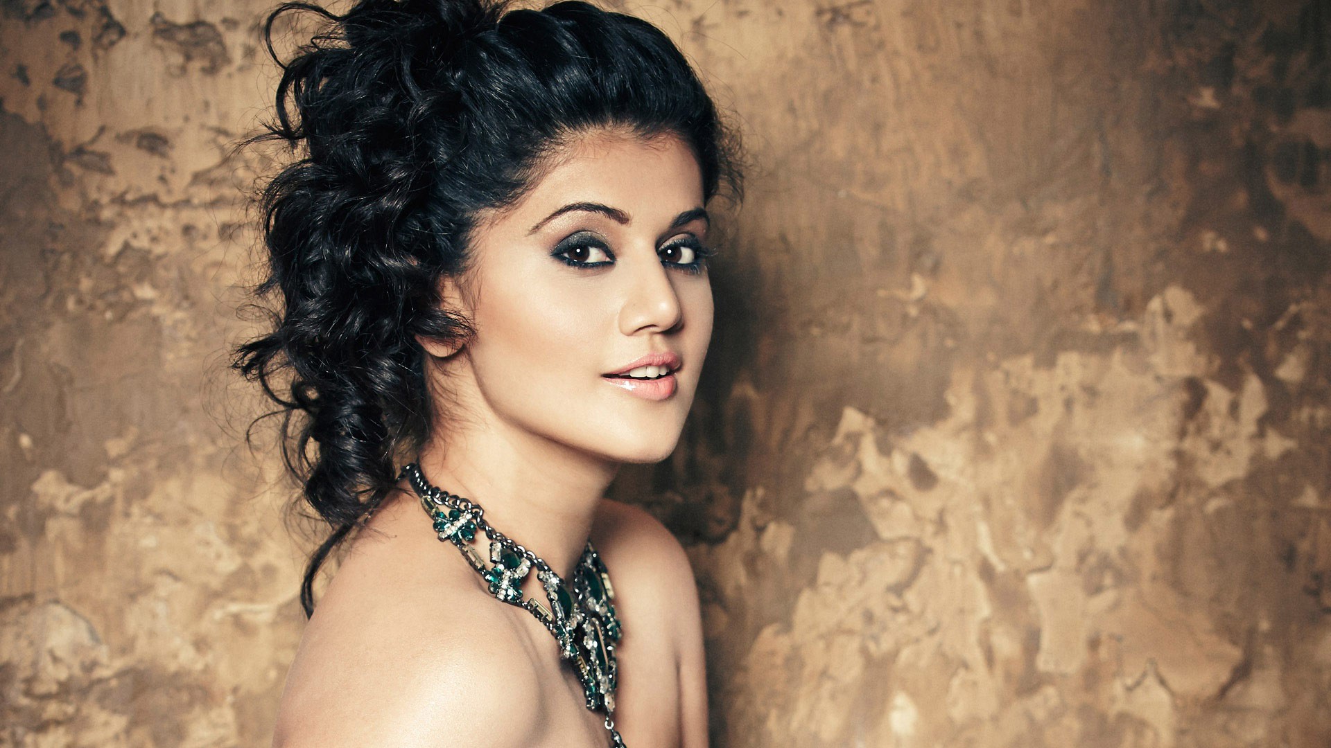 Description: A woman with a necklace on posing for a picture in a photo studio with a wall behind her and a wall behind her.
