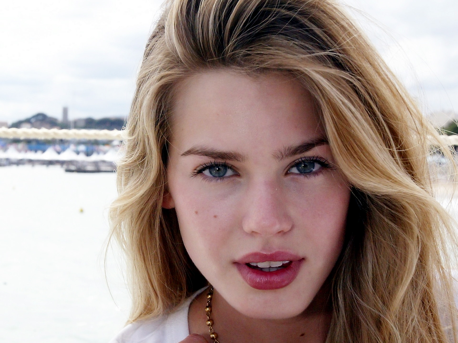 Description: A woman with a necklace on her neck posing for a picture in front of a body of water with a bridge in the background.
