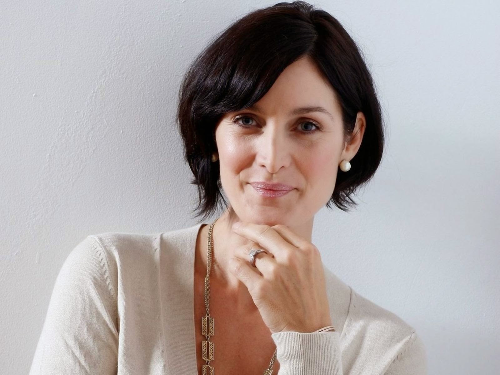 Description: A woman with a necklace and a ring on her neck looking at the camera with a smile on her face.