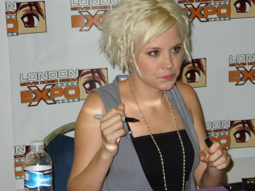 Description: A woman with a necklace on sitting at a table with a bottle of water in front of her and a microphone in her hand.
