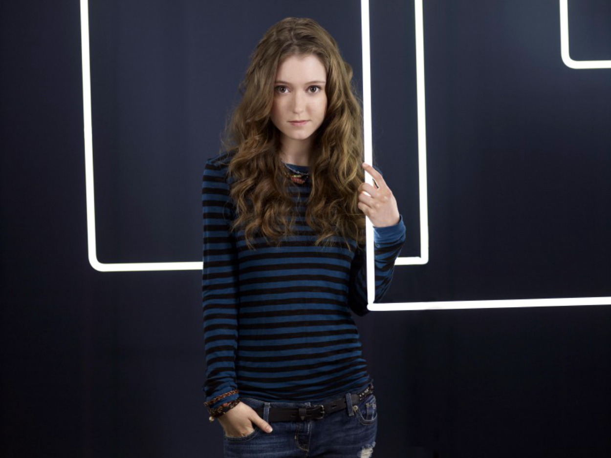 Description: A woman standing in front of a neon sign with her finger up in the air and her hand on her hip.