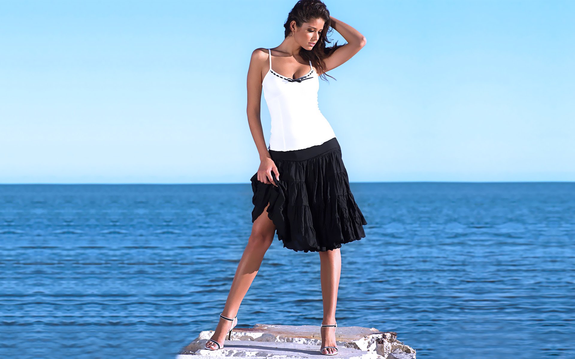 Description: A woman standing on a rock in front of the ocean wearing a black and white dress and heels with her hand on her head.