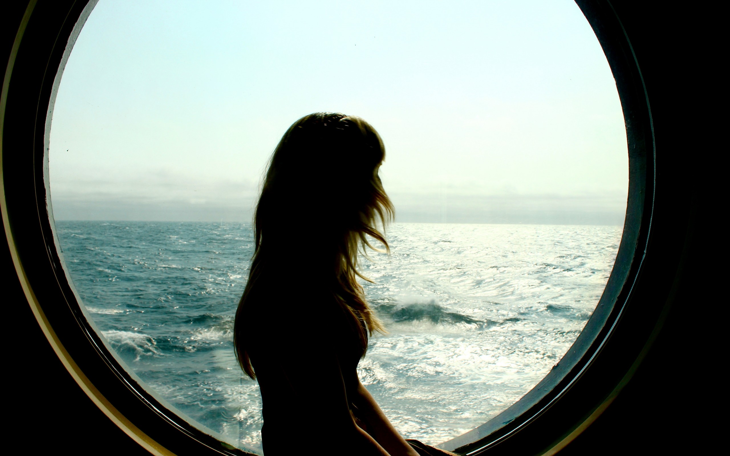 Description: A woman looking out a window at the ocean from a boat on the water's edge.