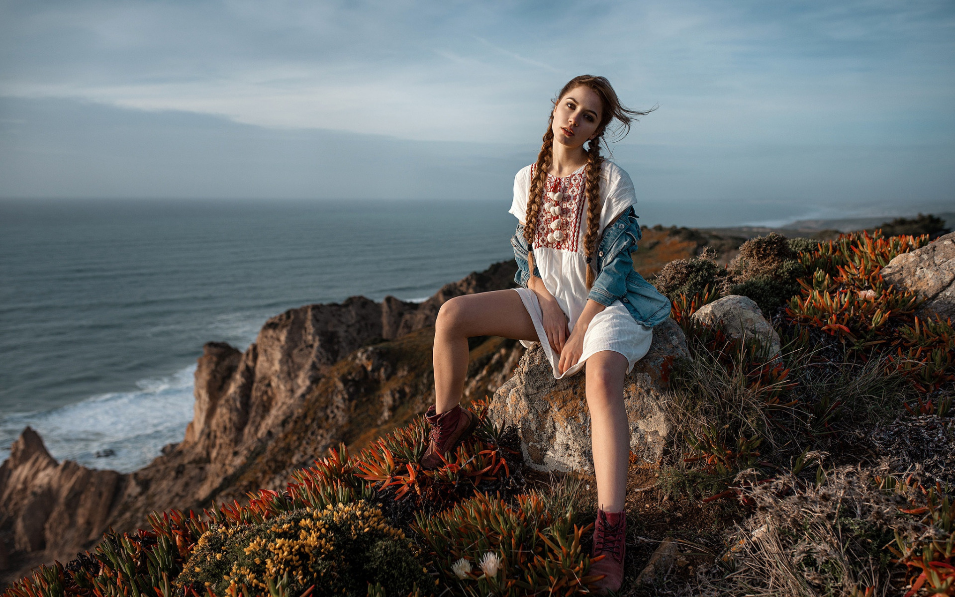 Description: A woman sitting on a rock near the ocean with a view of the ocean behind her and a cliff.