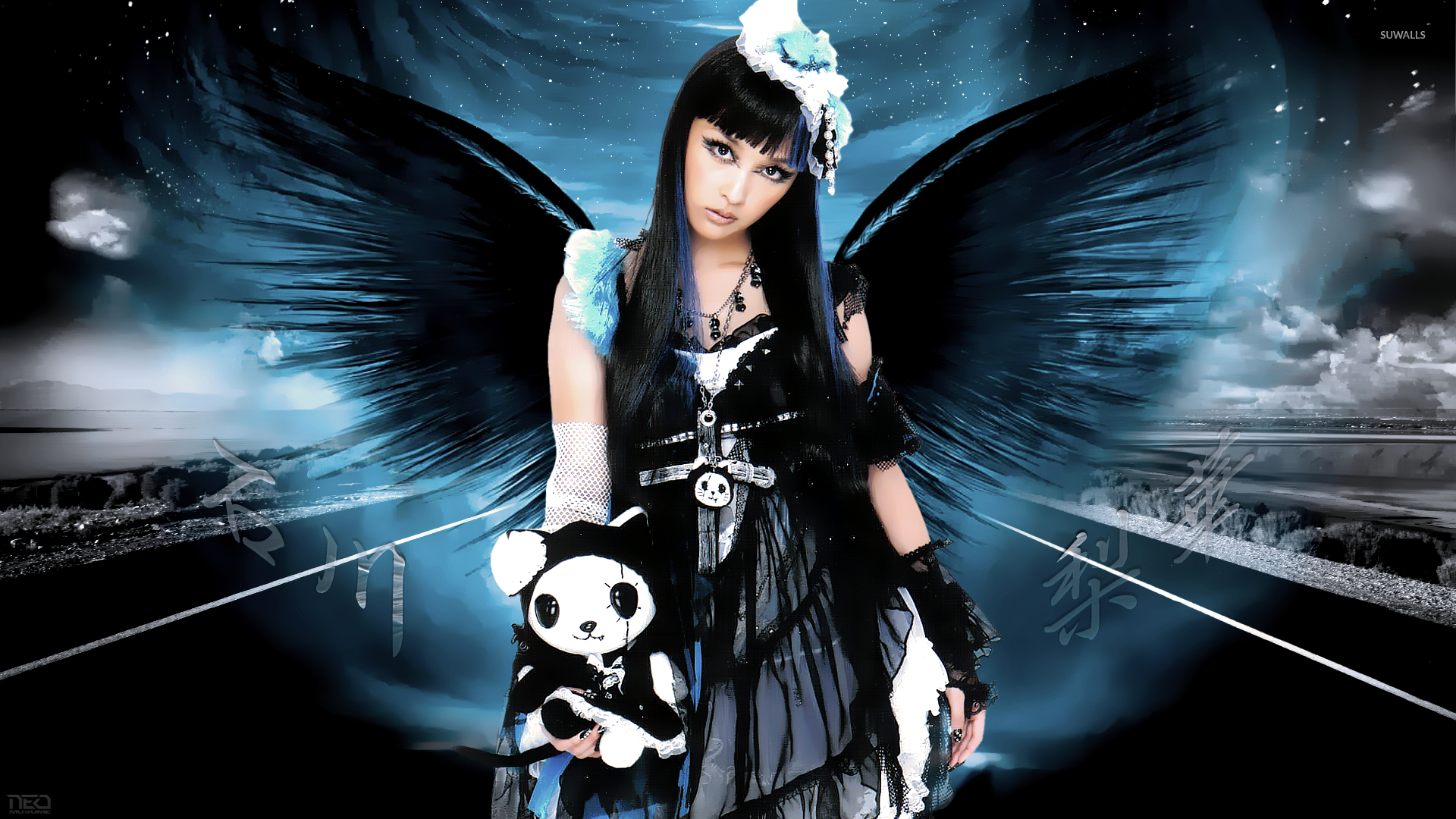 Description: A woman with a panda bear in her hand and a black and white angel wings on her head and a blue sky background.