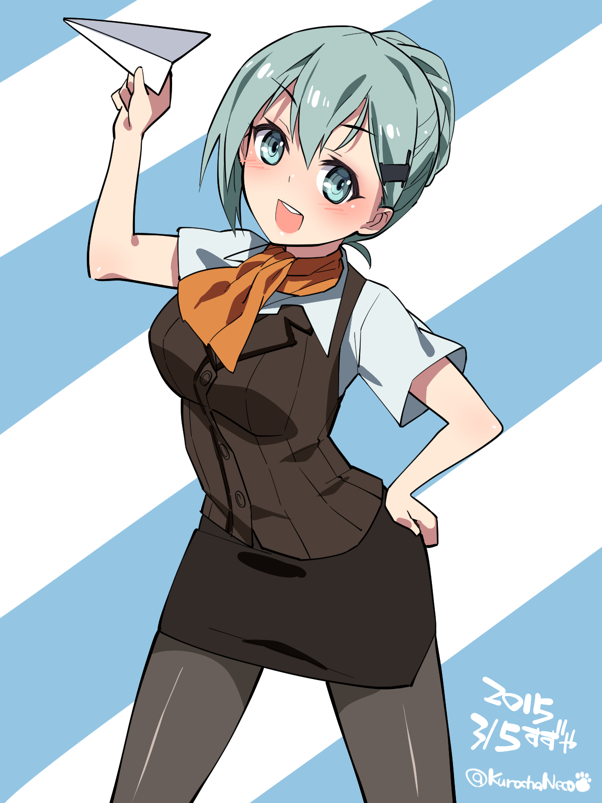 Description: A woman with a paper airplane in her hand and a blue background with stripes on it.