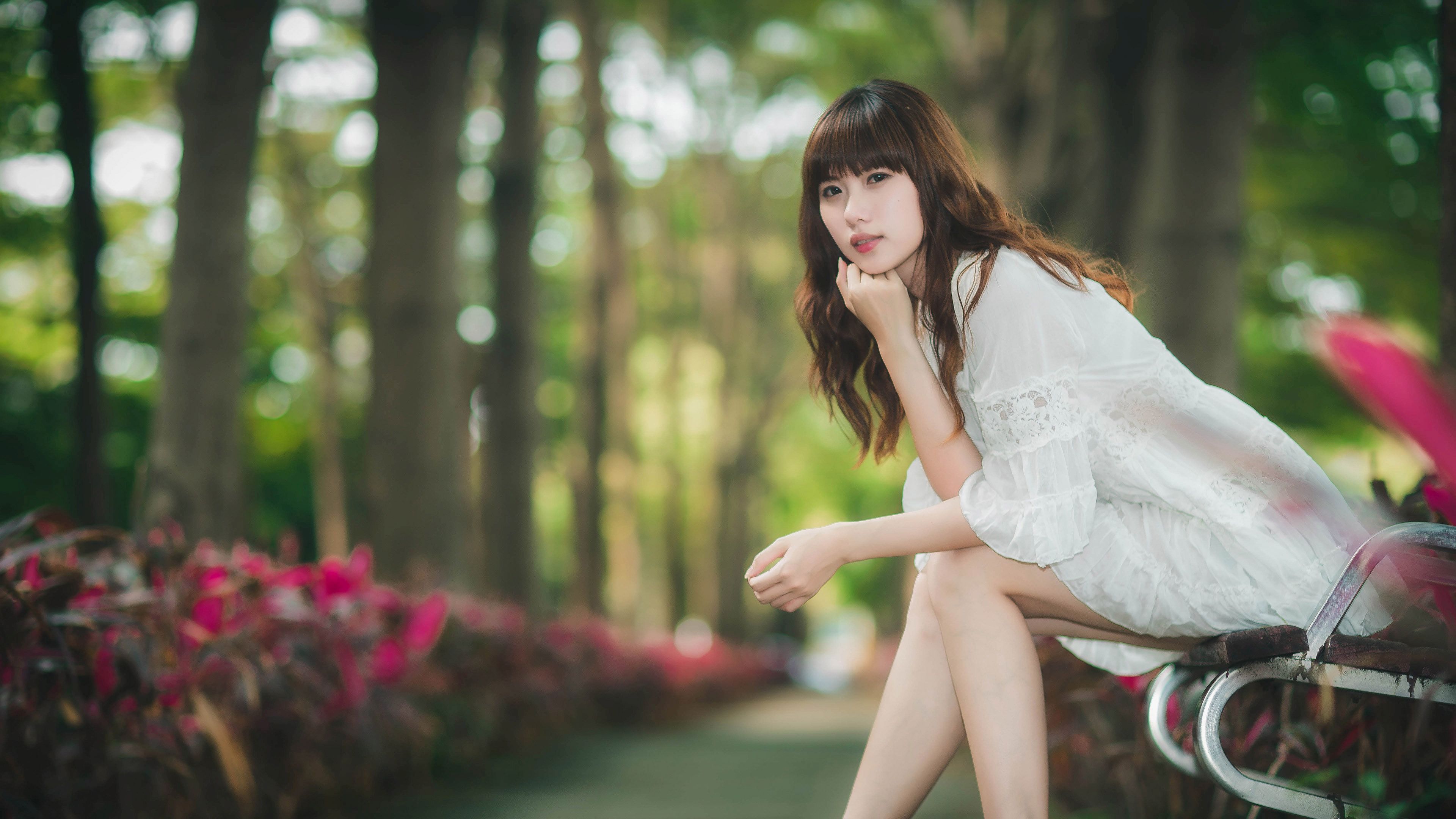Description: A woman sitting on a bench in a park with flowers in the background and a path leading to the park.