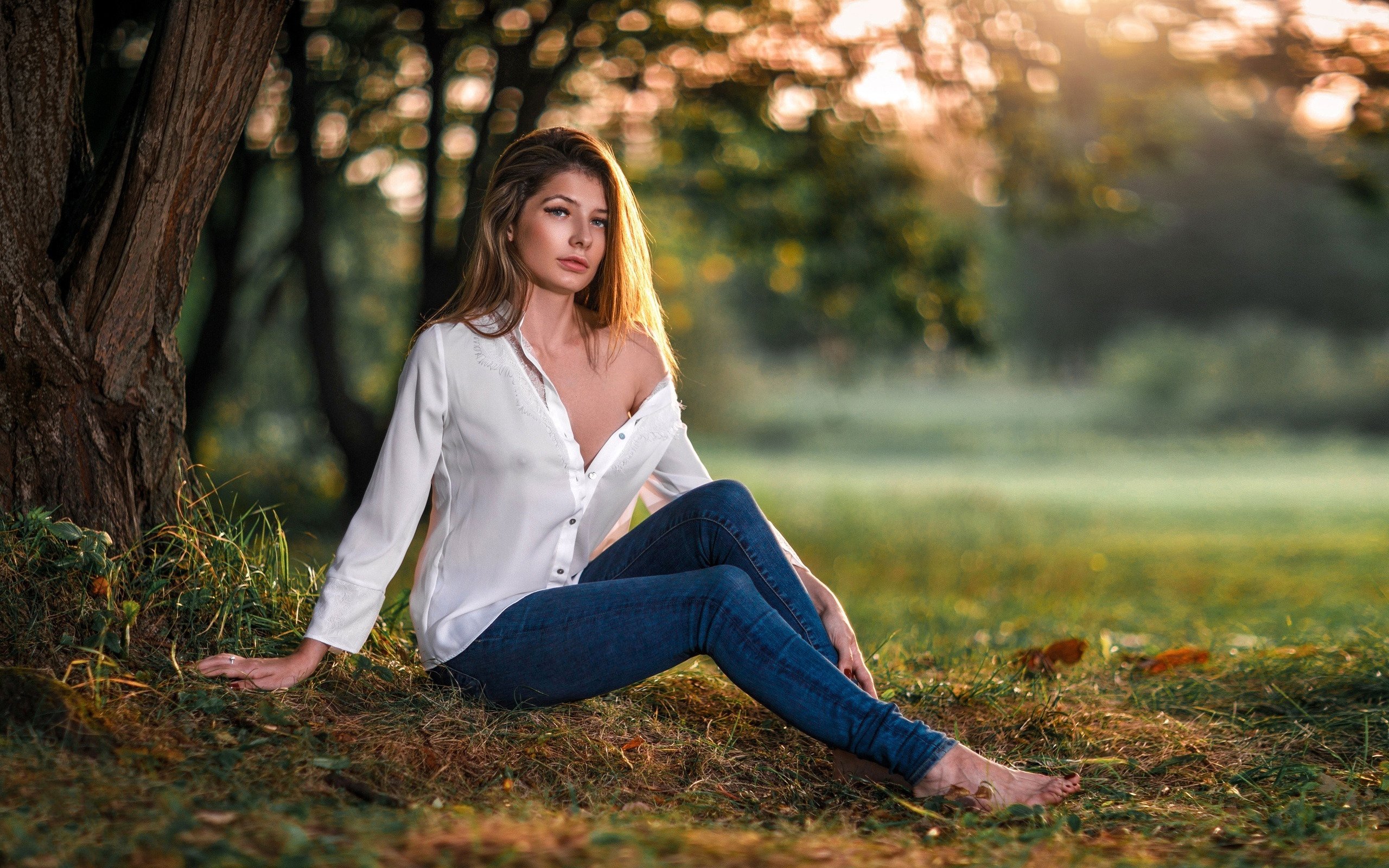 Description: A woman sitting on the ground in a park with trees in the background and grass in the foreground.