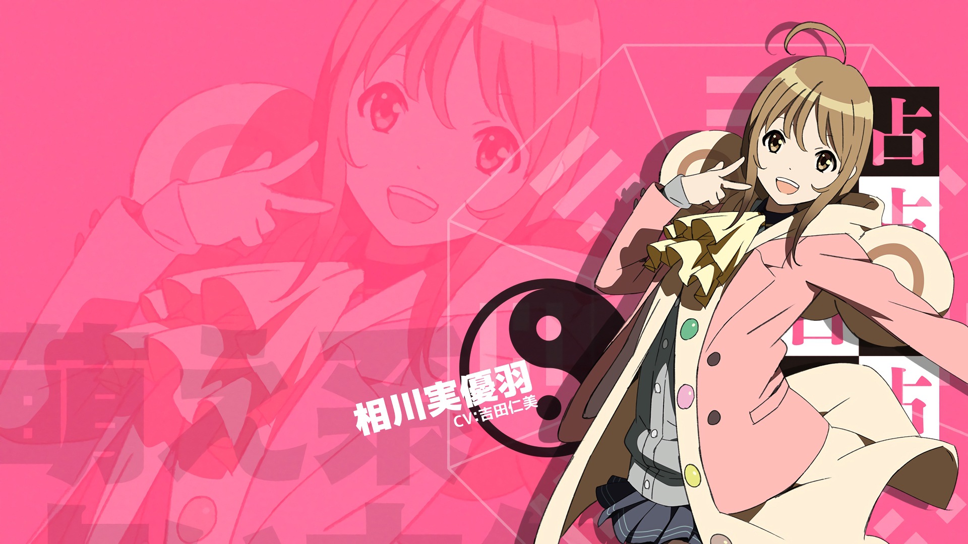 Description: A woman in a pink coat and a pink background with anime characters on it and a pink background with asian characters.