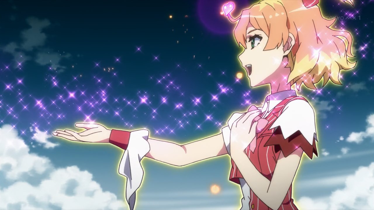Description: A woman in a pink dress is holding out her hand with stars in the background and a sky with clouds.