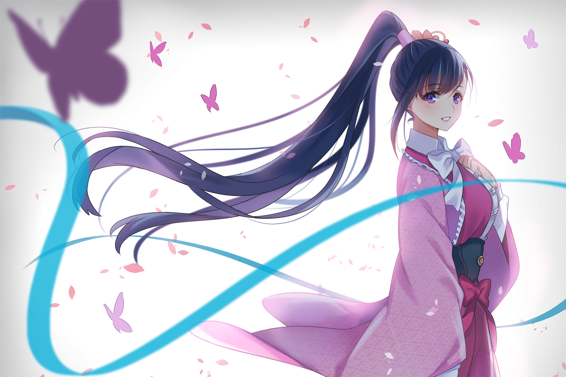 Description: A woman in a pink dress with long hair and a butterfly in the background with a butterfly in her hand.