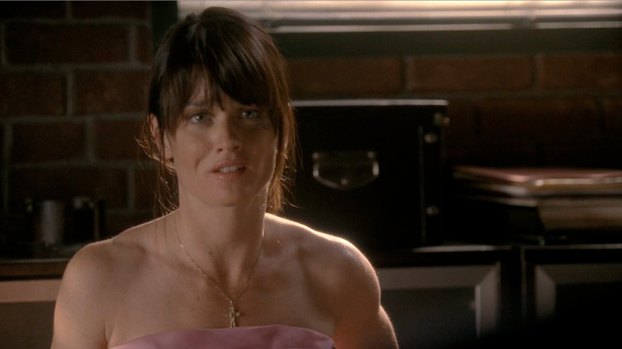 Description: A woman in a pink dress is staring at something in the distance with a brick wall behind her and a microwave in the background.