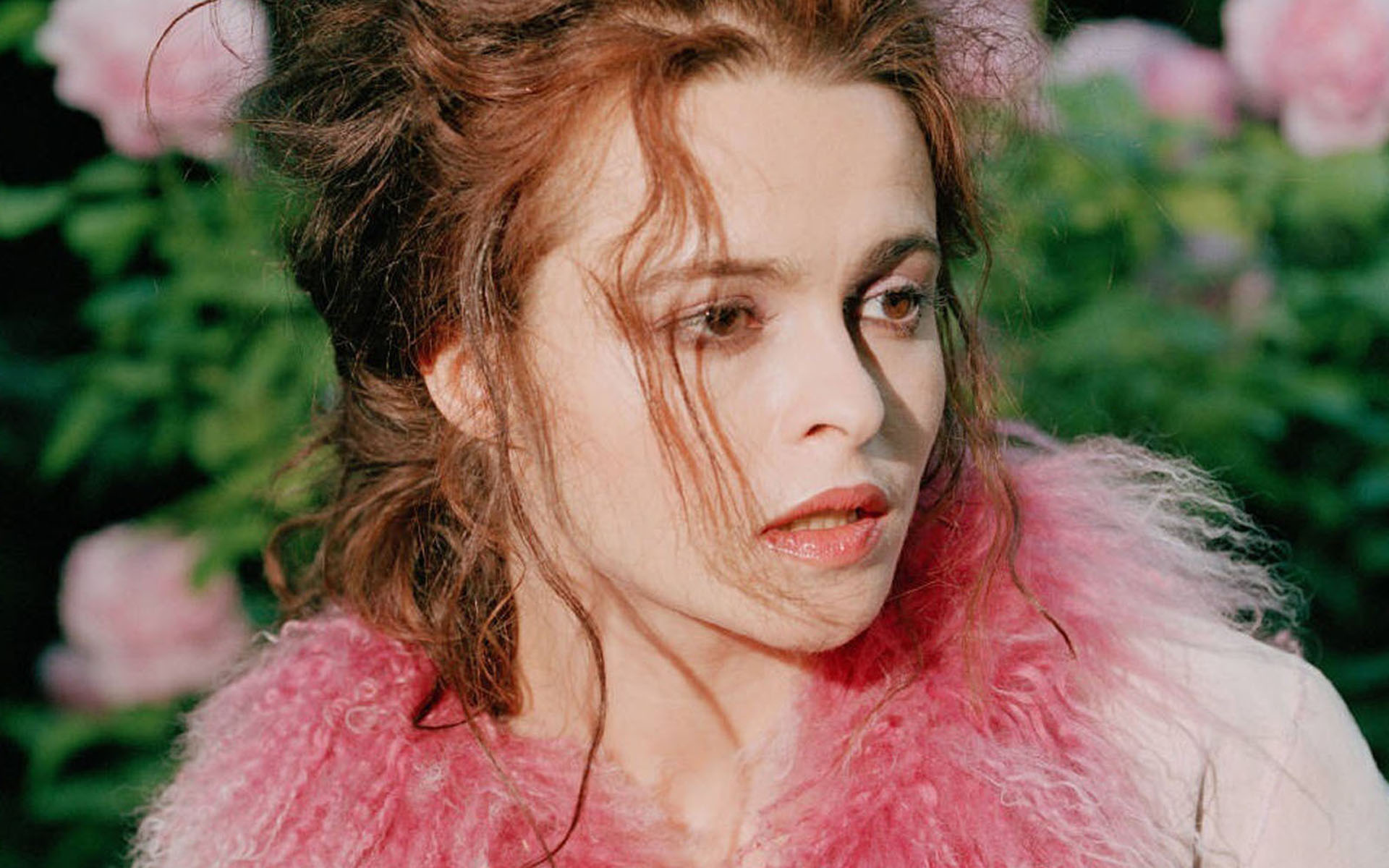 Description: A woman with a pink fur vest and a flower bush in the background.
