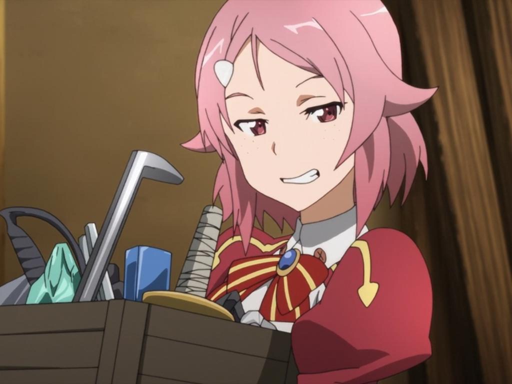 Description: A woman with pink hair holding a box of items in her hand and looking at the camera with a smile.