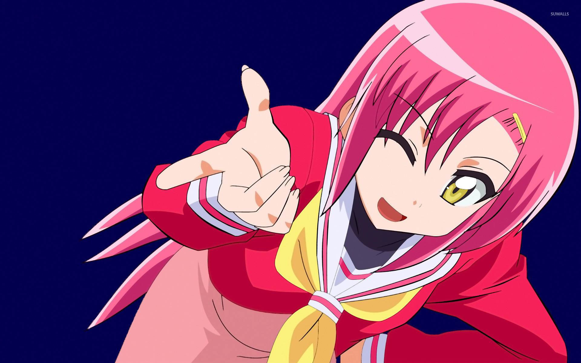 Description: A woman with pink hair pointing at something with her finger up and a smile on her face and a yellow scarf around her neck.